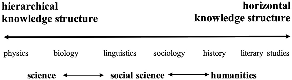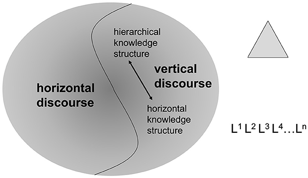 In addition, two forms of vertical discourse are distinguished—hierarchical knowledge structures vs. horizontal ones. A hierarchical knowledge structure is “a coherent, explicit and systematically principled structure, hierarchically organized” which “attempts to create very general propositions and theories, which integrate knowledge at lower levels, and in this way shows underlying uniformities across an expanding range of apparently different phenomena” (Bernstein, 1999, p. 161–162)—e.g., physics, chemistry, or biology. A horizontal knowledge structure, on the other hand, is defined as “a series of specialized languages with specialized modes of interrogation and criteria for the construction and circulation of texts” (Bernstein, 1999, p. 162)—e.g., linguistic theories which position themselves as functional, arguably West Coast Functionalism, Lexical Functional Grammar, Functional Grammar, Discourse Functional Grammar, Role and Reference Grammar or Systemic Functional Linguistics. Bernstein uses a triangle to symbolize hierarchical knowledge structures since they attempt to create ever more general propositions which account for an expanding range of phenomena (e.g., Newtonian physics, superseded by Einstein's relativity, and superseded by string theory). Horizontal knowledge structures, on the other hand, are visualized by a succession of “Ls” since what counts as development is the introduction of a new perspective, typically by junior speakers who challenge the power and legitimacy of more senior ones (e.g., Marxist history, feminist history, and post-colonial history). A synoptic overview of these distinctions is offered in Figure 1.