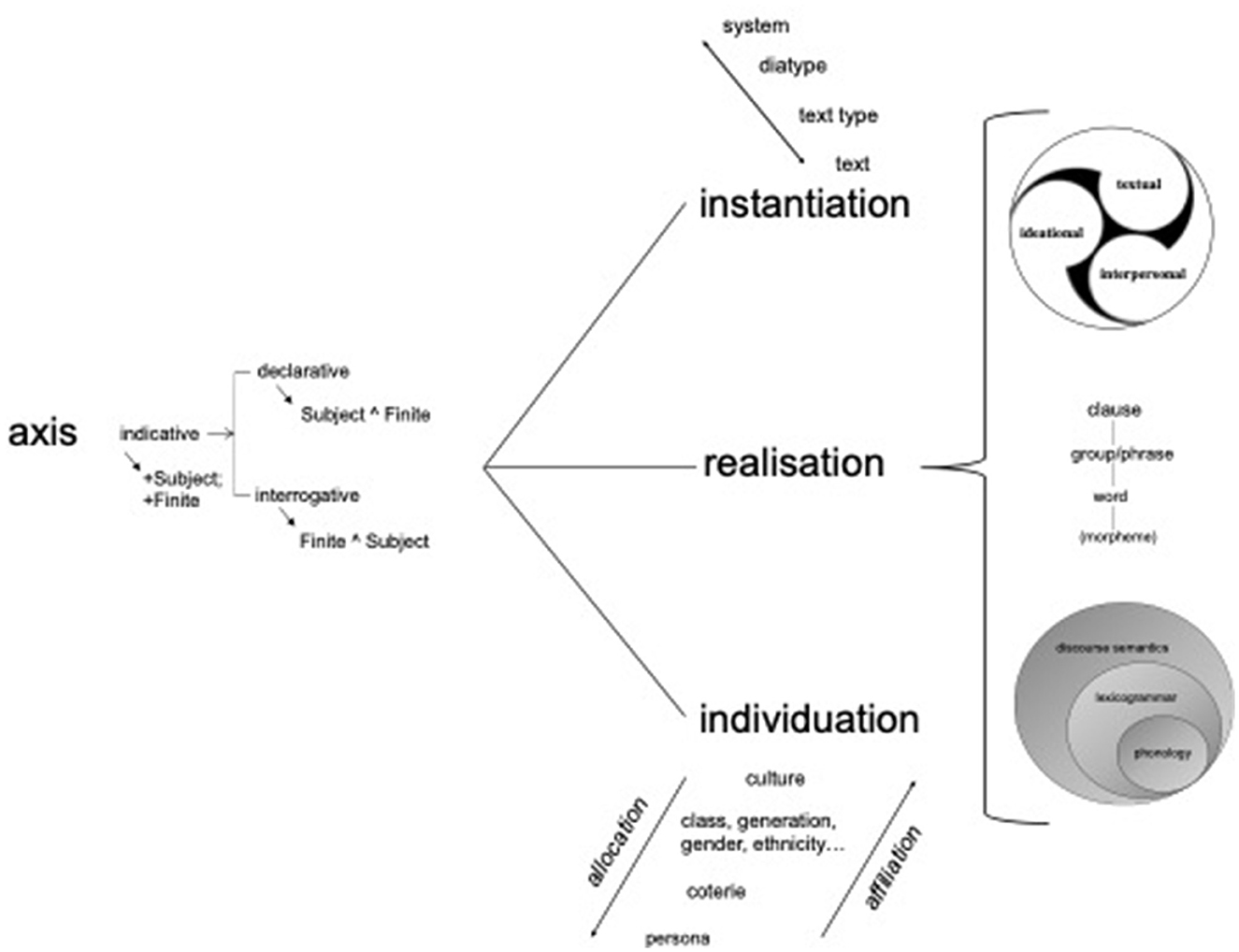 Third, axis. In SFL, other dimensions of internal grammar are all articulated in relation to axis (Martin et al., 2013). The concepts of rank, metafunction, and strata, in other words, are all based on bundles of interdependent features (organized with respect to constituency, type of meaning, or level of abstraction, respectively). Instantiation has to do with the manifestation of system in text and the generalization of instances as system, over time—as texts unfold (logogenesis), as speakers mature (ontogenesis), or as languages evolve (phylogenesis). Individuation has to do with the allocation of systems to members of a culture and their use of those systems to affiliate in social groups—once again, over time. Take away axis (e.g., O'Toole, 1994) and you may arguably be left with one kind of functional theory or another but not Systemic Functional Linguistics or Systemic Functional Semiotics as the disciplines are being construed here.