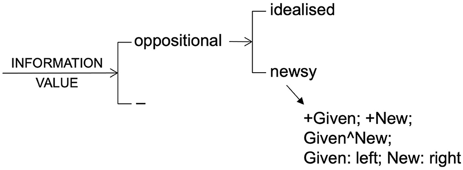 This means, for example, in relation to an SFS description of some horizontally polarized images that an optional information value system can be set up realized by the function structure Given ∧ New, without making the claim that all horizontally polarized imagic syntagms in fact realize this system. Relevant options are extended from Kress and van Leeuwen (2021, p. 216–217) in Figure 4. The name of the system is INFORMATION VALUE; it is an optional system; if the feature [newsy] is selected, then the structural functions Given and New are present, in the sequence Given followed by New (with Given realized to the left and New to the right). This formalization makes no claims about all horizontally polarized systems; it simply positions [newsy] ones as having a Given ∧ New structure realized by a horizontally polarized imagic syntagm. Note in passing that this is perhaps too generous a reading of Kress and van Leeuwen's often criticized account of information structure in polarized images, but my point here is that SFS need not fall foul of their apparent overgeneralisations.