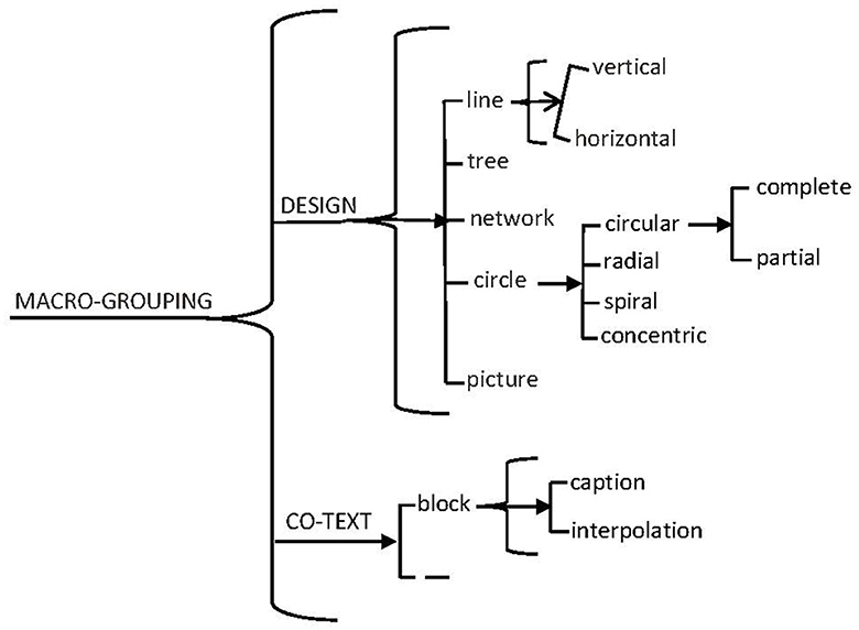 Martin and Unsworth (2024) take this step in their work on secondary school science infographics, drawing directly on work by Hiippala et al. (2021), Hiippala (2023). Martin and Unsworth's network for MACRO-GROUPING is presented in Figure 5. Therein, a square bracket means “or” (as shown in Figures 2, 3), a slanted square bracket indicates a cline, a brace means “and,” and a combination of brace and square bracket means “and/or.” So for the CO-TEXT systems, we have the option of including a text block or not, and if we choose to do so, we can include a caption or an interpolation or both. To follow one path in the DESIGN system, if we choose line, it can be more or less vertical or horizontal or both (in the latter case we end up with a grid).
