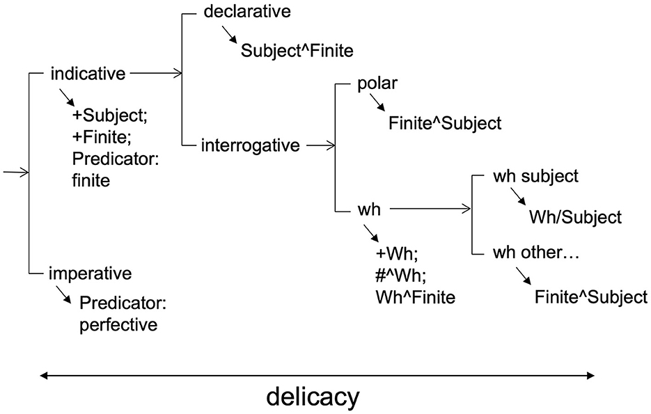 Fourth, delicacy. Recognition of mediating languages of description (L1.5s) carries with it the idea that the relation between L1 and L2 can be treated as a cline. SFL's approach to axis is well adapted to a conception of this kind since systems are arranged from more general to more specific along a cline referred to as delicacy. Thus, in Figure 6, for example, indicative clauses are more general than interrogative ones, which are in turn more general than wh ones and so on. This makes it possible to be more and less specific about what gets treated as L1, L1.5, and L2–perhaps treating the [indicative/imperative] opposition as L1.5, but remaining agnostic about more delicate options, pending construction of L2 (i.e., a specific language's grammar of MOOD). It is important to keep in mind in relation to this point that positioning more or less general systems as L1.5 can be done without making any claims at all about how such systems are realized in structure. Commitment to structural realizations of mood options needs to be withheld for L2, since structures realizing mood vary considerably across languages (Martin, 2018; Martin et al., 2021).