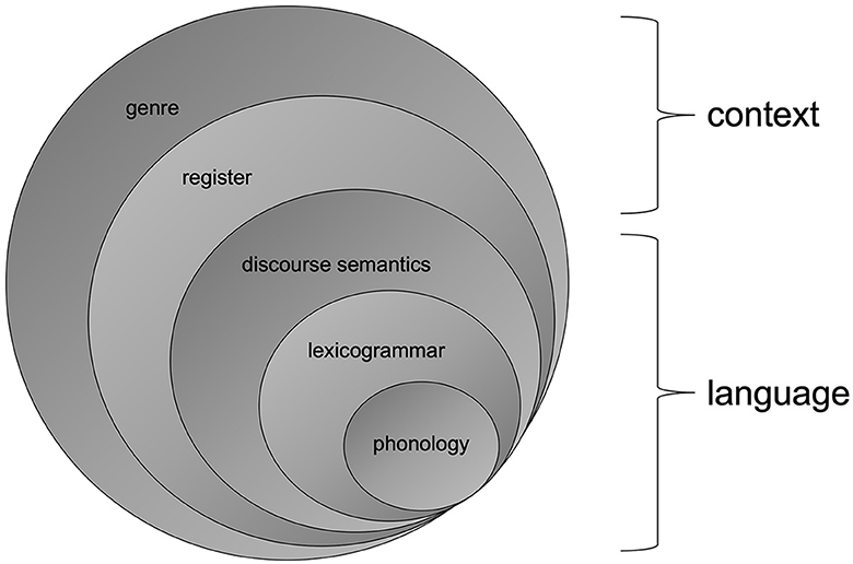 Fifth, context. In SFL, context is treated as form (Figure 7), not substance (as connotative semiotics in Hjelmslev's terms). In the model of SFL assumed here, context is stratified as register and genre (Martin, 1992; Martin and Rose, 2008), and register is modeled metafunctionally in proportion to its realization in language—i.e., field is to ideational meaning, as tenor is to interpersonal meaning, and as mode is to textual meaning. This move allows context strata to be treated as resources for making meaning and modeled axially, comparably to language ones (Doran and Martin, 2021; Doran et al., 2024; Martin and Doran, in press). These context dimensions of SFL's L1 are less well articulated and more controversial than language ones—probably because of their level of abstraction and concomitant realization as patterns of language patterns in addition to a lack of clarity in argumentation as far as the distinction between realization and instantiation is concerned.