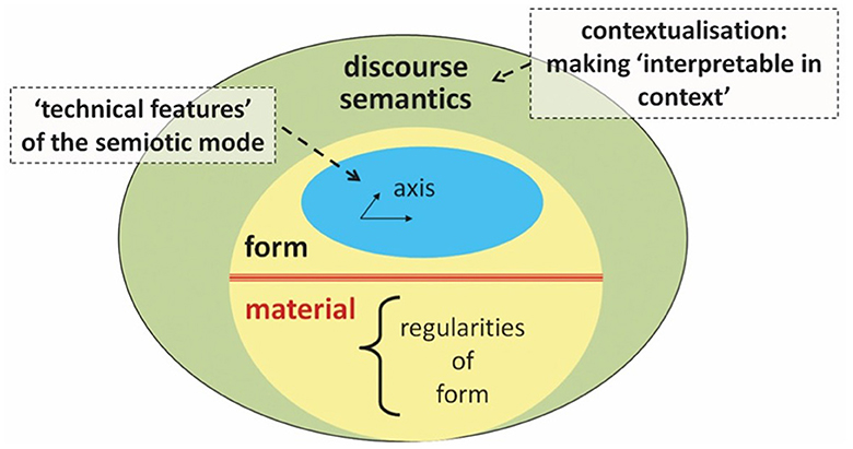 SFL's stratified model of language and context, as presented in Figure 7, provides a useful point of departure for comparison with Bateman's diagrammatic illustrations of his modeling of semiotic modes. Bateman et al. (2017, p. 117) introduce the diagram in Figure 8, consisting of three strata—“the material substrate or dimension, the technical features organized along several axes of descriptions (abbreviated as ‘form'), and the level of discourse semantics.” Compared to SFS, this treats the “etics” of materiality as a stratum proper and groups it together with the stratum of form—the two together realizing discourse semantics.