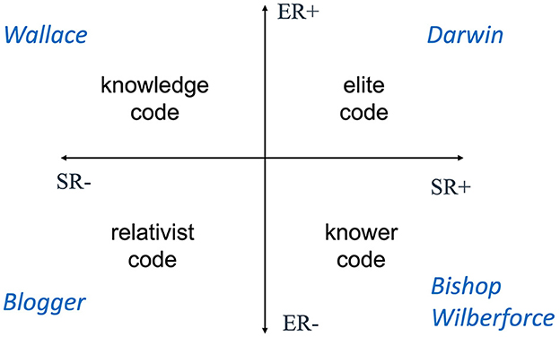 As foregrounded in Maton's Legitimation Code Theory (LCT), disciplinarity needs to be considered from the complementary perspectives of knowledge and knowers (Maton, 2014). Accordingly, LCT's legitimation code referred to as specialization takes into account both epistemic relations (between knowledge and what it describes) and social relations (between knowledge and who is producing it). Based on the relative strength of epistemic and social relations, LCT establishes a topology8 of legitimation codes, with four principal “modalities”—knowledge codes (ER+, SR–) for which legitimacy depends on what you know; knower codes (ER–, SR+) where what matters is who you are; elite codes (ER+, SR+) where it matters both what you know and who you are; and relativist codes (ER–, SR–) through which everyone's voice and knowledge is equally valid (Maton, 2014, p. 30–33). This framework is exemplified in Figure 9 with reference to speaking rights in 19th century debates about evolution. The key players were Watson (knowledge code), a middle class biologist who made a living by selling specimens to private collectors and museums, Darwin (elite code), an wealthy biologist who married into the Wedgewood family pottery fortune, and Bishop Wilberforce (knower code), a gifted public speaker and high ranking clergyman. They are positioned according to specialization in Figure 9 below. Tellingly, it is Darwin (not Watson) who comes readily to mind when we think of evolution, along perhaps with Bishop Wilberforce who played the role of Huxley's protagonist in the famous debate at a meeting of the British Science Association in 1860. To complete the picture, I have imagined a know-it-all nameless blogger (relativist code), opining about evolution in the 21st century.