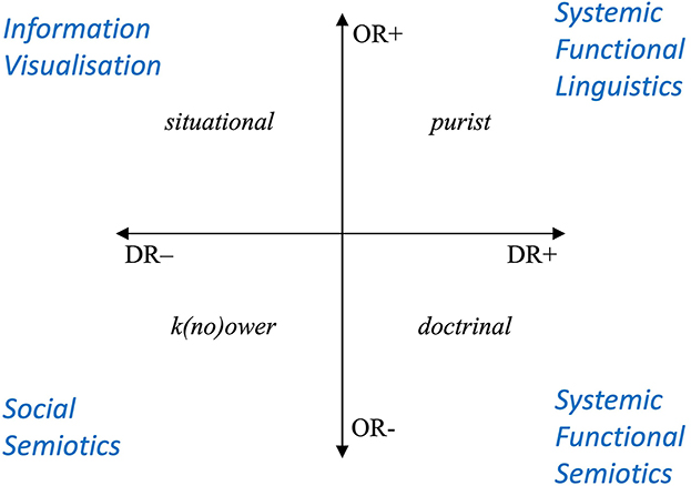Digging deeper into epistemic relations, Maton (2014, p. 175–177) distinguishes relations between knowledge practices and the part of the world they are oriented to (ontic relations, OR) and relations between knowledge practices (discursive relations, DR). Stronger ontic and discursive relations (OR+/DR+) establish a purist code, which emphasizes both the object of study and how it is studied. Weaker ontic relations but strong discursive relations (OR–/DR+) establish a doctrinal code, which legitimate a multiplicity of objects of study but foregrounds a particular way of studying them. Stronger ontic but weaker discursive relations (OR+/DR–) allow for a situational code, whereby a specific object of study is in focus but it can be approached from multiple points of view (or as Maton allows, no clear knowledge code at all). Weaker ontic and discursive relations (OR–/DR–) legitimate an approach, which is unlimited with respect to both what is studied and how. As suggested in Figure 10, a framework of this kind would position SFL as purist (since it studies language from one theoretical perspective), SFS as doctrinal (since it studies any semiotic system but always from the perspective of SFL informed theory), social semiotics (a la Kress and van Leeuwen, 2005) as DR–/OR– (since it encourages the study of multimodality from different points of view), and something such as information visualization as DR–/OR+ (since it focusses on graphic representations of complex data by whatever means afford a clear “synoptic” overview). Seen in these terms, one of Bateman's objectives is to re-orient the current trajectory of Multimodal Studies, which at some conferences seems to sprawl toward ever weaker discursive and ontic relations; he wants to shift its trajectory toward stronger discursive relations whatever its object of study (without, we might reiterate here, falling foul of the linguistic imperialism and predatory interdisciplinarity that SFS's doctrinal stance might be accused of).