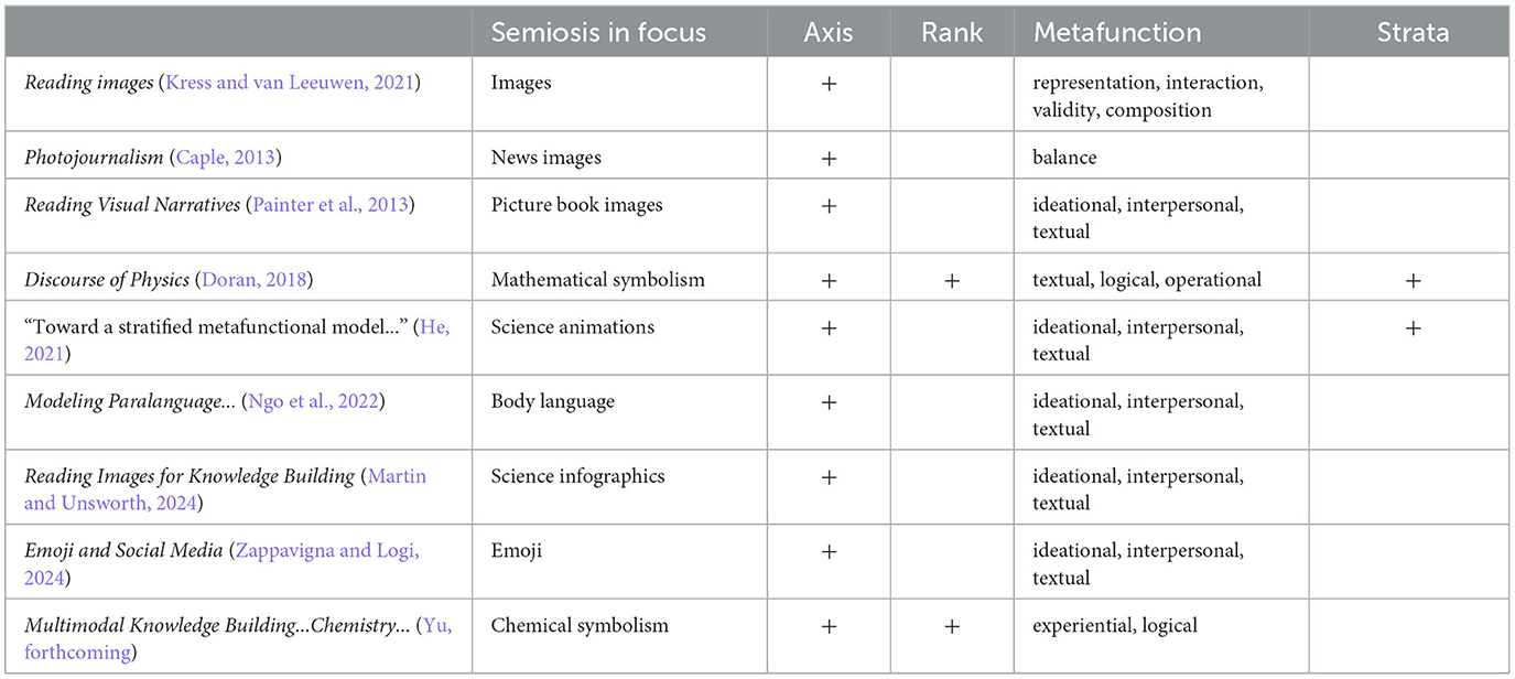 Read in tandem with Kress's many declarations of a new age of meaning making called “Multimodality” (e.g., Kress, 2003, 2010, 2015), superseding language and the discipline of linguistics, serious questions have to be raised about the work on multimodality informed by a theory of language such as Systemic Functional Linguistics (SFL)—work evolving into something we might call Systemic Functional Semiotics (SFS) via publications such as Kress and van Leeuwen's Reading Images (Kress and van Leeuwen, 1990 and subsequent editions), Caple (2013) Photojournalism, Doran (2018) The Discourse of Physics, Painter et al.'s (2013) Reading Visual Narratives, He (2021) “Toward a stratified metafunctional model of animation,” Ngo et al. (2022) Modeling Paralanguage using Systemic Functional Semiotics, Martin and Unsworth (2024) Reading Images for Knowledge Building, Zappavigna and Logi (2024) Emoji and Social Media Paralanguage, and Yu (forthcoming) Multimodal Knowledge Building in Secondary School Chemistry Textbooks.