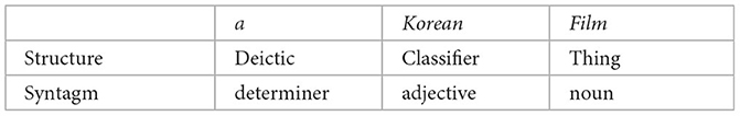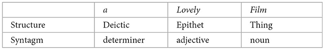 Second, structure and syntagm. As far as the description of grammatical “form” is concerned, SFL does not restrict its description to what Whorf (1945) called phenotypes—i.e., single or multi-segment syntagms consisting (for grammar) of classes of morpheme, word, group/phrase, or clause. To develop rich meaning-making grammatical descriptions, SFL is also inspired by Whorf's notion of cryptotypes. Halliday and Matthiessen (2014) distinction between Epithet and Classifier in English can be used to illustrate this point here. From the perspective of system, English nominal groups make a distinction between describing and classifying. Both types of nominal groups can be realized by the same syntagm (i.e., determiner ∧ adjective ∧ noun), but a covert distinction can be uncovered by asking whether the adjective in the relevant syntagm is gradable or not. Describing adjectives are gradable (a really lovely film), whereas classifying adjectives are not (*a very Korean film).3 Accordingly, the same syntagm is assigned different structures, as in examples (1) and (2) below. SFL grammar descriptions in other words are not simply a catalog of syntagms; they build function structures on top of syntagms to reflect the meaning-making valeur at stake.