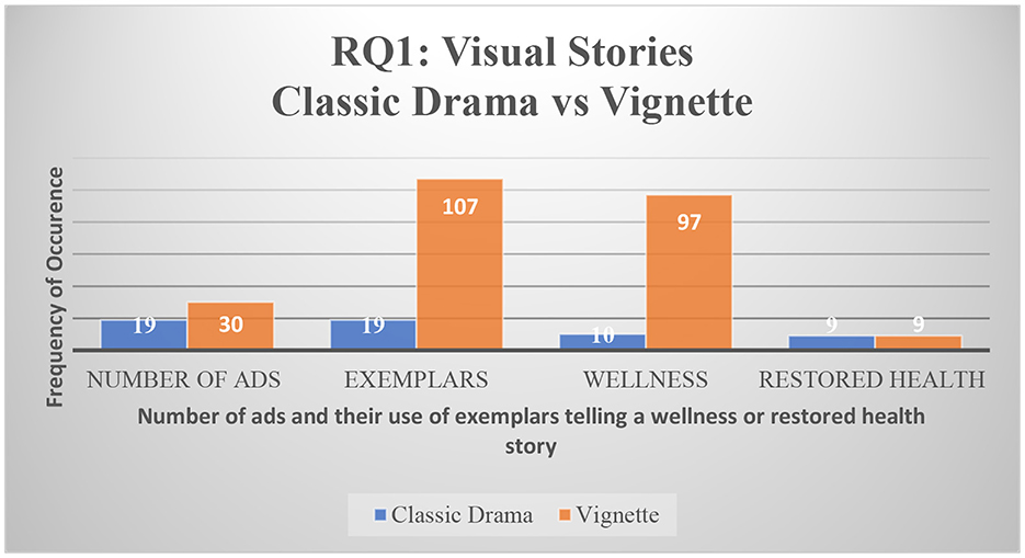 RQ1: What message(s) about health are communicated in a DTCA's visual stories? To answer this question, the exemplars' visual health in the 49 DTCAs was assessed. They were identified as completely healthy or symptomatic at the beginning of the ad and healthy by the end. The sample ads were watched and data were recorded in an Excel spreadsheet, which was then imported into an NVIVO project. The information recorded about the ad included the title, a summary of the visual story, the narrative type, the activity in which the exemplar was engaged, and the exemplar's health condition during the narrative. The advertisement title was listed first. The advertiser creates the advertisement titles, which include the name of the medicine advertised and a general title that reflects the content in the ad (e.g., Cosentyx See Me; Cosentyx is a medicine that treats psoriasis). Then, the ads were summarized and key information was identified. The narrative type was categorized as “classic drama” or “vignette” and the exemplar's observable health was identified as healthy (showed no health symptoms related to the condition that the medication treats—asymptomatic) or restored health (symptomatic at the beginning of the ad, but asymptomatic as the ad progressed). In vignette advertisements, the health condition was categorized according to the condition(s) represented in the ad: healthy if none of the exemplars was symptomatic, restored health if all of the exemplars were symptomatic at the beginning and their health was restored by the end of the ad. Wellness and restored health were categorized if some exemplars were asymptomatic and some were symptomatic. Trained coders coded the setting and exemplar's actions.