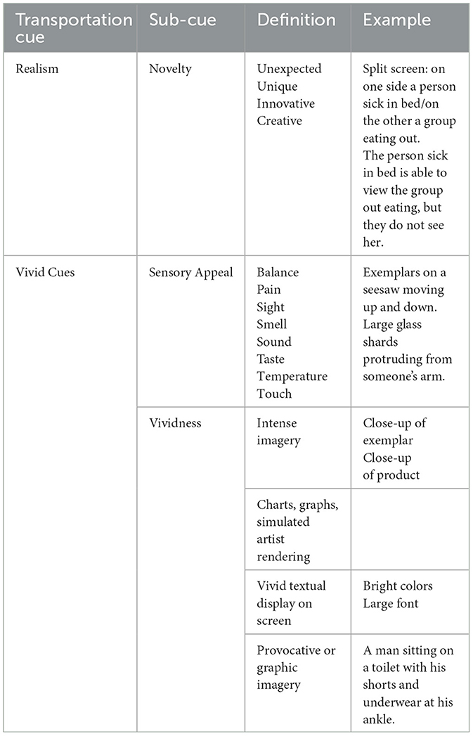 Narratives also influence attitudes and behavioral responses (Castonguay et al., 2016) as a result of viewers' heightened emotional responses (Slater, 2011) when their senses are aroused and stimulated (Bateman and Wildfeuer, 2014). Sensory arousal and stimulation occur through two prominent paths: transportation and identification (Igartua and Vega Casanova, 2016), which are distinct yet interdependent processes. This research focused uniquely on transportation cues, which have the ability to engage viewers and draw them into the storyline, which some scholars have argued facilitates identification (see Green and Clark, 2013).