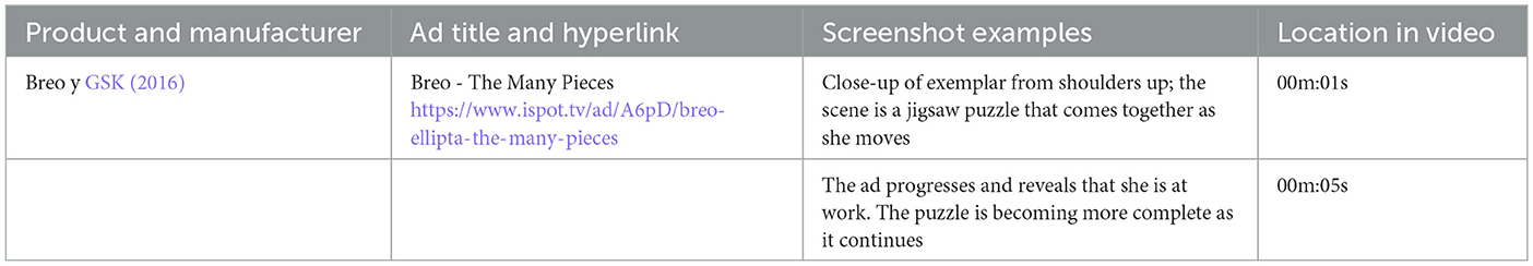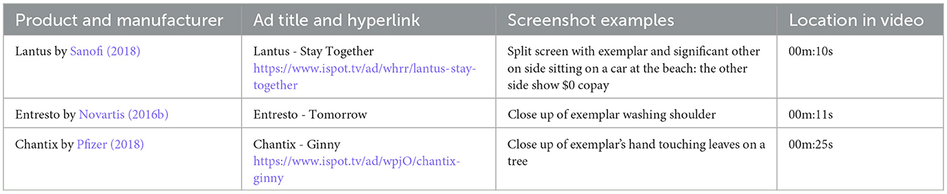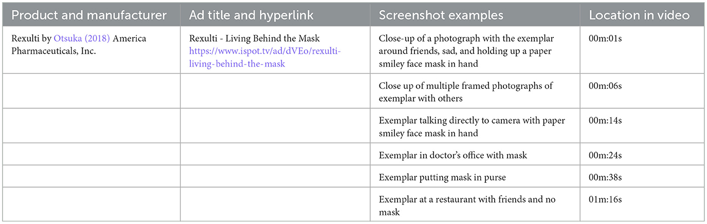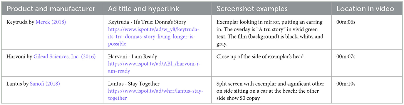 Table 3. Ad examples of multiple exemplars and medicine intervention, hyperlink to ad, and timestamp.