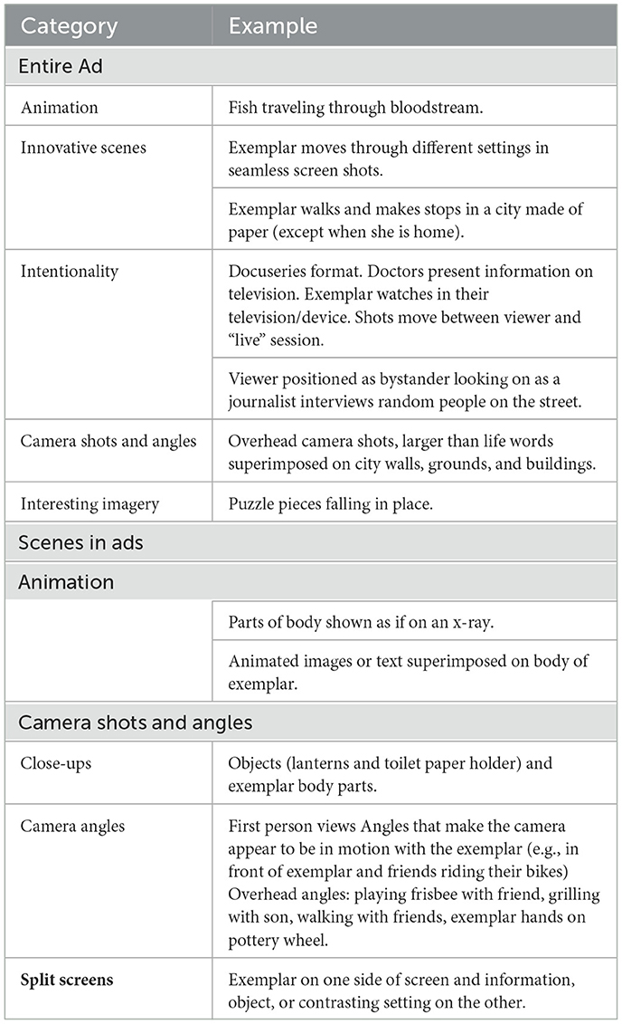Codes were developed using an a priori deductive approach, and were derived from research in the literature that discussed the components of transportation in narratives, including realism, vivid imagery, and vivid sensory cues (see Table 1). After completing the framework for the codes, five ads were selected randomly to test the framework. After several iterations of those five ads were observed, the emergent codes were tested on five additional ads, so that all codes were applied to a total of 10 ads. During the sample coding, it became apparent that typicality and novelty were redundant, and although realism includes typicality and novelty, only novelty was used. Novelty is defined as a divergence from expectations that is interesting and unanticipated or presents information in an unexpected way. Therefore, novelty codes were determined by visual information that was unique, unanticipated, engaging, and interesting. For example, showing a split screen with the sick person on one side in bed as they watch their family eat out with friends at a restaurant on the other would be considered a novel approach. As defined in the literature, novelty appears to be subjective. There are no clearly defined steps in the literature to determine novelty in an image or video. However, coders were instructed to code scenes that appeared unique, interesting, innovative, engaging, surprising, or unanticipated. The data coded as novel were downloaded and described in a Word document, and then categorized.