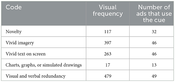 The transportation cue used most frequently was vivid cues. Advertising literature addresses the persuasiveness of vivid cues and their effect on viewers. They demand attention and engage viewers emotionally. In addition, vivid cues in transportation increase engagement and arouse curiosity. Engaged viewers are more likely to believe messages when cognitive resources are disabled by the engaging content (Slater and Rouner, 2002) and advertisements are viewed more positively when compelling visuals and sensory information are used (Cho et al., 2014). There were numerous engaging, shocking, and attention-attracting cues in this dataset. Sullivan et al. (2021) found that positive information increases the perceptions of a drug's efficacy. The various strategies, such as close-ups, distinct colors, and beautiful imagery, are vivid cues intended to draw attention. These contribute to the realism of the advertisement, which influences the perception of the ad and the drug overall.