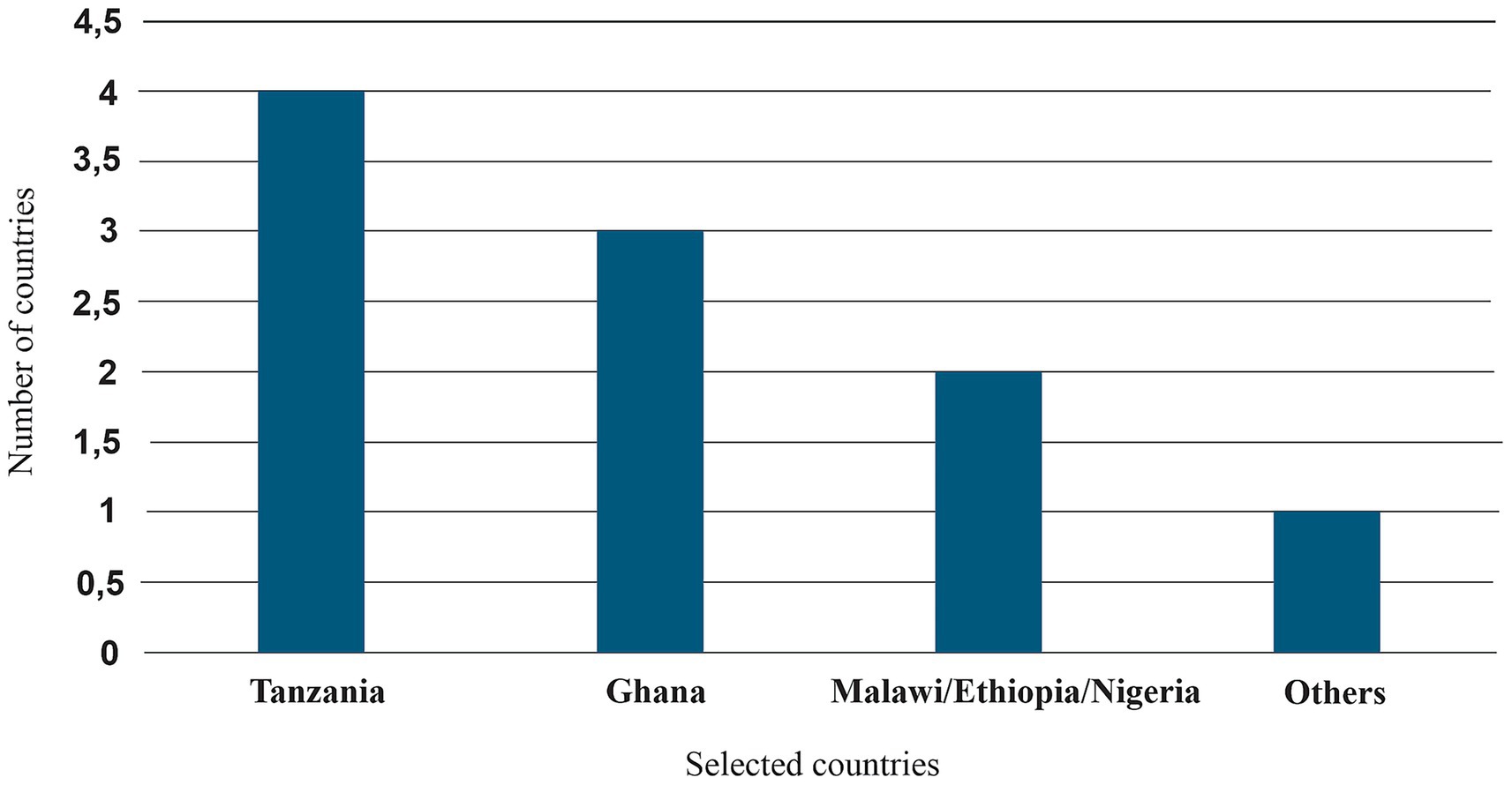 Only 24 countries were identified as implementing video-based health education. These include Tanzania (n = 4), Ghana (n = 3), Malawi (n = 2), Ethiopia (n = 2), Nigeria (n = 2), Kenya (n = 1), Botswana (n = 1), Uganda (n = 1), Rwanda (n = 1), Burundi (n = 1), Niger (n = 1), the Democratic Republic of the Congo (n = 1), São Tomé and Príncipe (n = 1), Benin (n = 1), Burkina Faso (n = 1), Gambia (n = 1), Guinea (n = 1), Guinea-Bissau (n = 1), Liberia (n = 1), Mali (n = 1), Mauritania (n = 1), Senegal (n = 1), Sierra Leone (n = 1), and Togo (n = 1). In this review, Tanzania and Ghana emerged as the countries with the most studies, followed by Malawi, Ethiopia, and Nigeria, as illustrated in Figure 2.