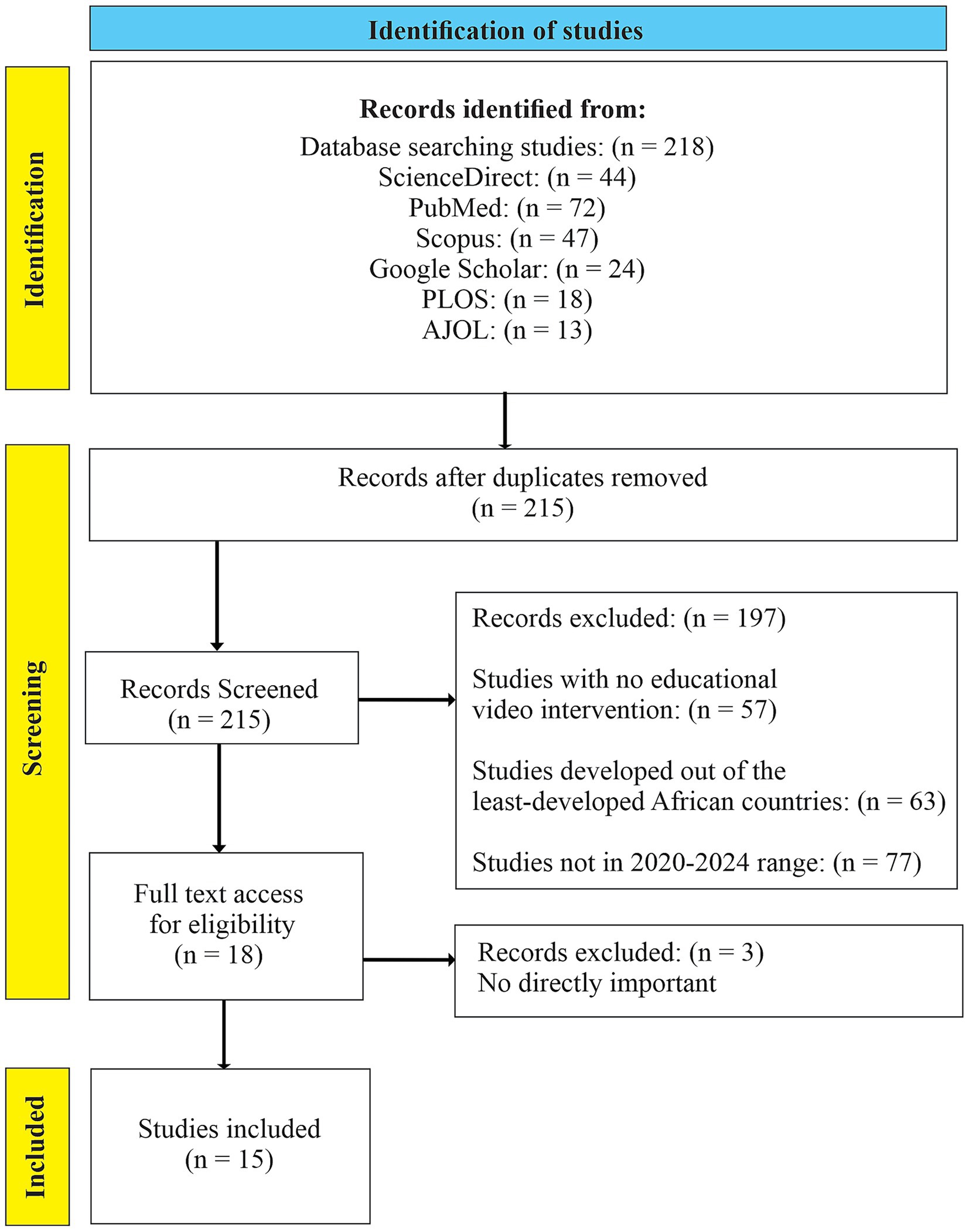 The database search yielded 218 papers, of which 15 met our selection criteria after excluding duplicates (n = 3). We excluded 197 articles for the following reasons: (1) no use of educational video (n = 57), (2) research was not conducted in the least-developed African countries (n = 63), and (3) studies fell outside the 2020–2024-year range (n = 77). Participants’ demographics included health workers who received video training (n = 4), patients, and/or citizens (n = 11), all of whom were assessed for their responses to video-based health education (Figure 1).