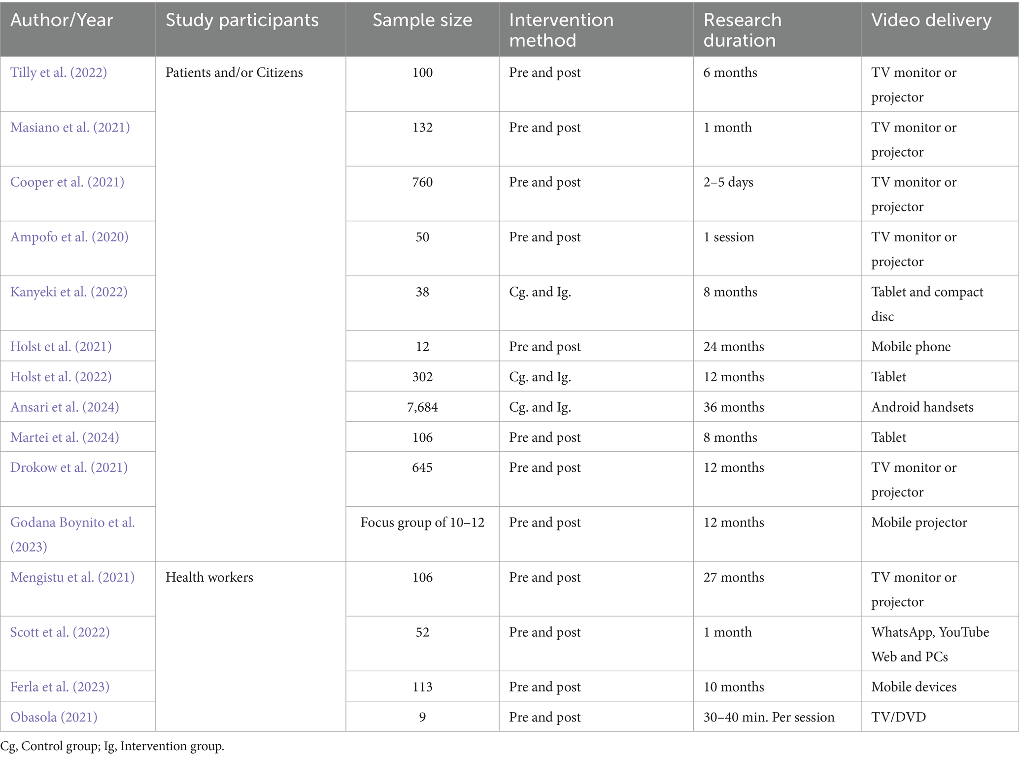 The studies utilized various media to present videos, including TV monitors or projectors (n = 6), mobile devices (n = 7) such as tablets, mobile phones, and portable projectors, online media (n = 1) through platforms such as YouTube, Web, and WhatsApp, and other formats (n = 1), such as TV, DVD, or compact disks. These video-based health education initiatives occurred in health facilities, schools, and occasionally in residential settings through door-to-door visits. The duration of the education programs varied from 30 to 40 min up to 36 months.