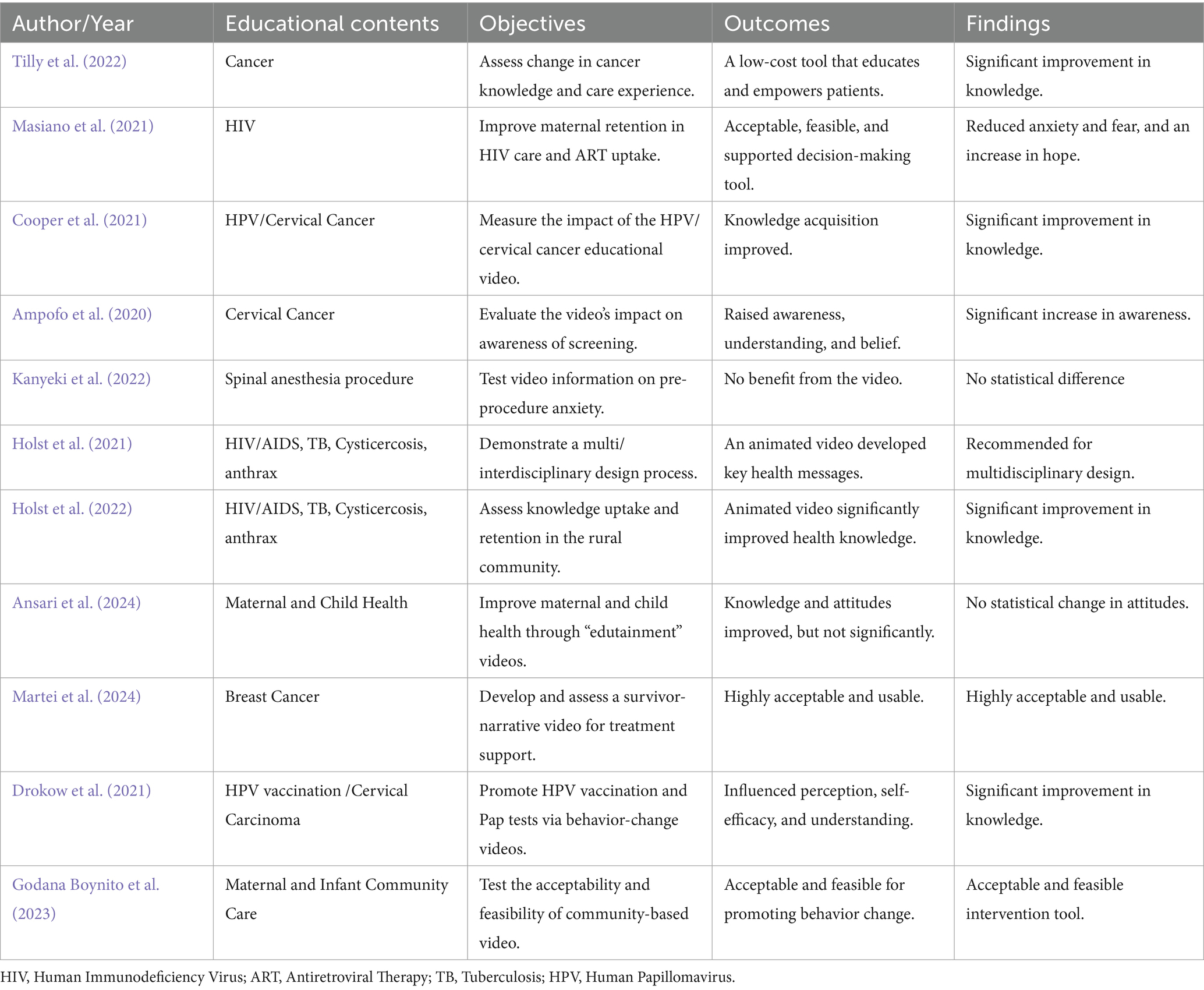The studies focusing on patients and/or citizens (n = 11) covered a range of topics. Of these, five (n = 5) focused on cancer-related subjects, using videos to discuss common myths, diagnostic procedures, bodily diseases, treatments, reactions to aftereffects, and quality of life (Martei et al., 2024). They aimed to raise awareness and knowledge about the screening and risks associated with human papillomavirus infection, the treatment and experiences of breast cancer survivors, and to promote vaccination, awareness, and counseling for the Pap smear test. Three studies (n = 3) addressed HIV-related issues (Holst et al., 2021; Masiano et al., 2021; Holst et al., 2022), through videos that highlighted the importance of antiretroviral therapy and addressed significant concerns regarding HIV/AIDS, tuberculosis, Taenia Solium (neuro) cysticercosis, taeniasis, and anthrax. Finally, the last three studies (n = 3) covered maternal and child health (Godana Boynito et al., 2023; Ansari et al., 2024), as well as spinal anesthesia procedures, including a video that reviews the pre-operative anxiety state (Kanyeki et al., 2022).