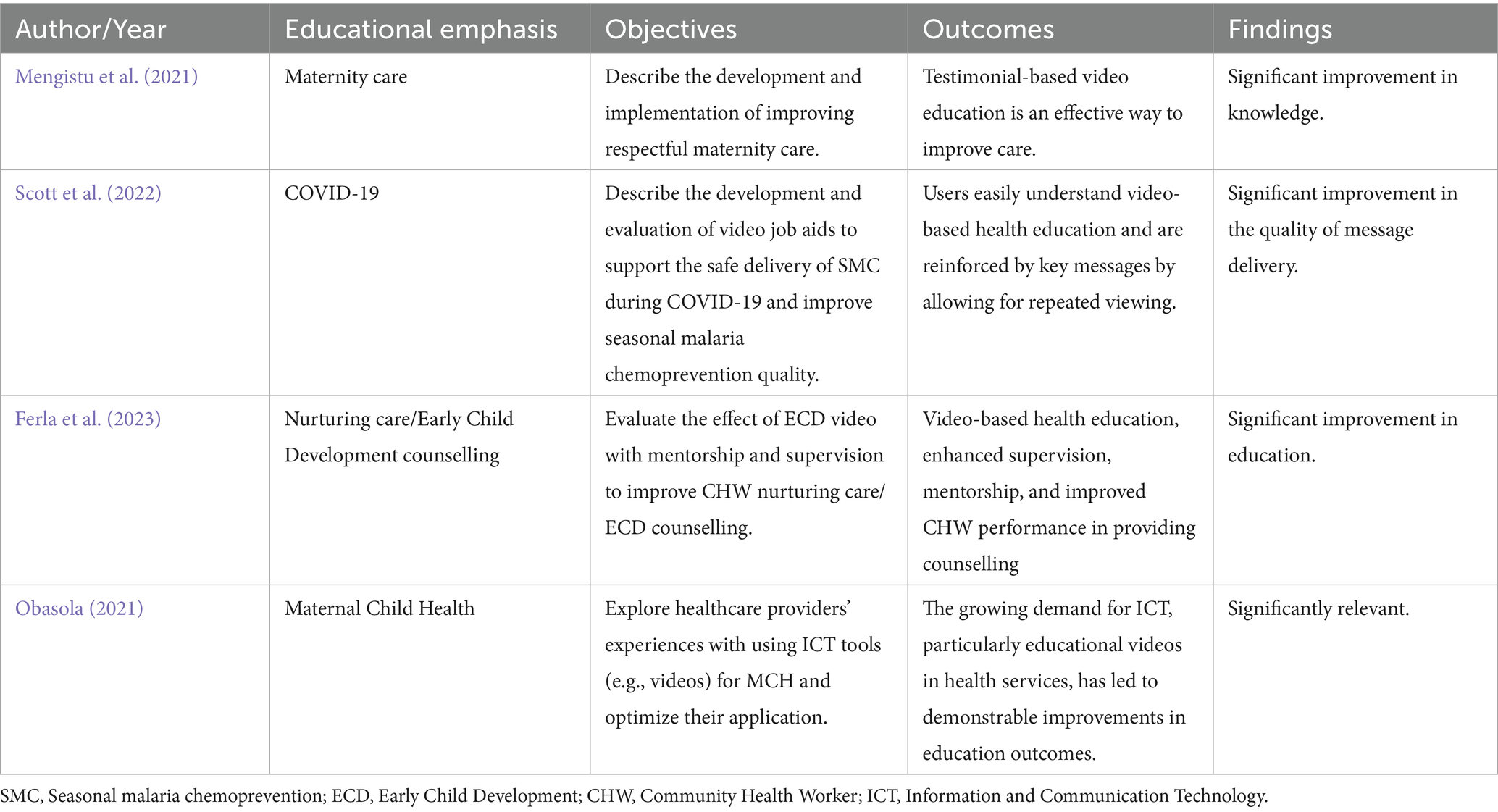 In general, the studies focused on video education initiatives covering topics such as cancer (n = 5, 33.3%; Martei et al., 2024; Drokow et al., 2021; Tilly et al., 2022; Cooper et al., 2021; Ampofo et al., 2020), HIV (n = 3, 20%; Holst et al., 2021; Masiano et al., 2021; Holst et al., 2022), maternity care (n = 5, 33.3%; Ferla et al., 2023; Godana Boynito et al., 2023; Obasola, 2021; Mengistu et al., 2021; Ansari et al., 2024), and other areas (n = 2, 13.3%, including COVID-19 and spinal anesthesia procedures; Scott et al., 2022; Kanyeki et al., 2022). In terms of preliminary outcomes, most studies (n = 13, 86.6%) found that the use of video proved effective, and in the remaining (n = 2, 13.3%), no significant differences were noted between video usage and no video.