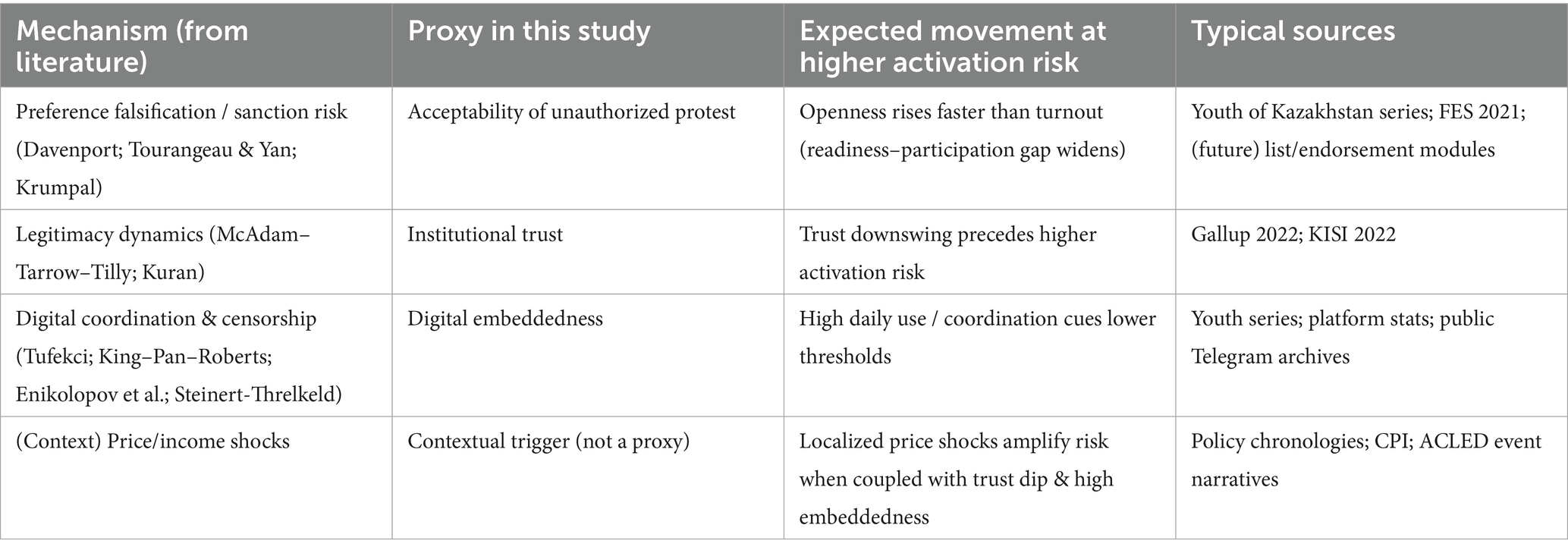 Existing work on youth protest in authoritarian settings is either normative-qualitative or cross-national and macro-structural; it rarely (i) operationalizes latent protest potential with replicable measures, (ii) links forecasting errors to identifiable survey mechanisms (preference falsification, nonresponse, closed digital coordination), or (iii) specifies a country-level activation configuration. We contribute on all three fronts by (1) defining a three-proxy monitoring set (acceptability of unauthorized protest; institutional trust; digital embeddedness), (2) consolidating forecasting-limit mechanisms in Section 5.3, and (3) isolating a Kazakhstan-specific shock–trust–network triad tied to January 2022 and the 2019–2024 trajectory.