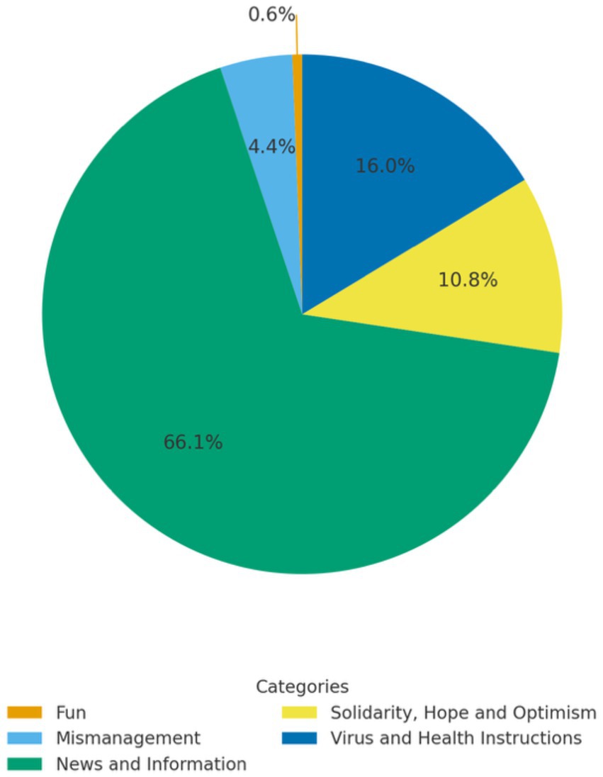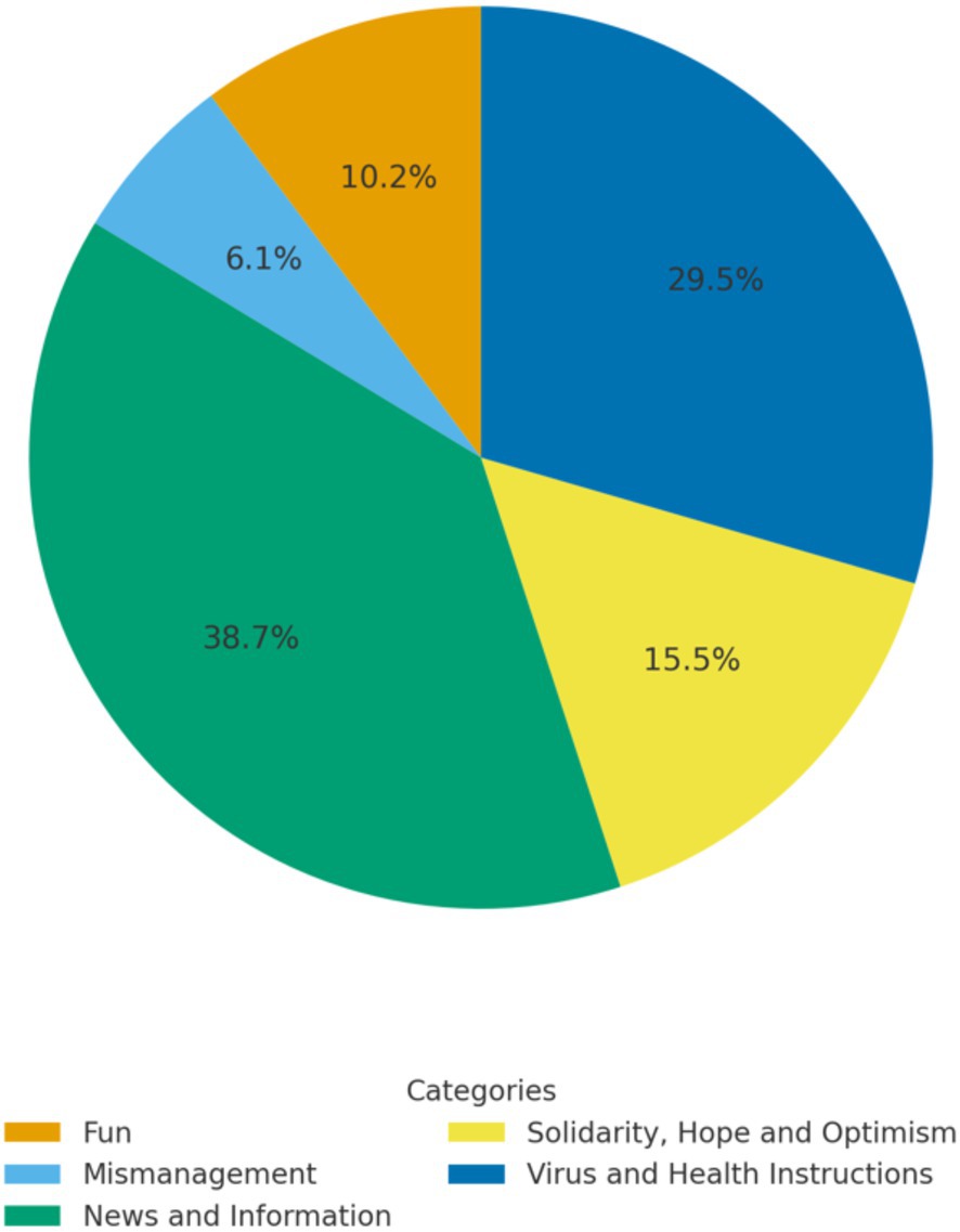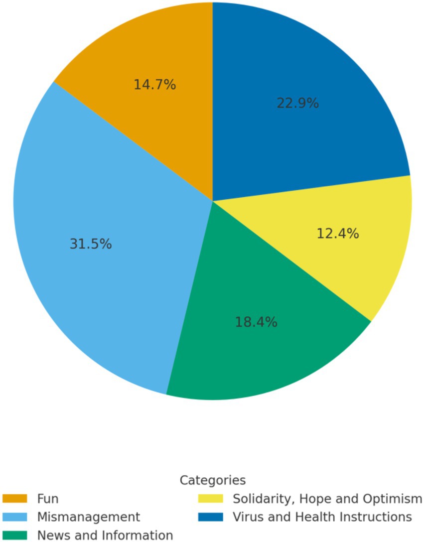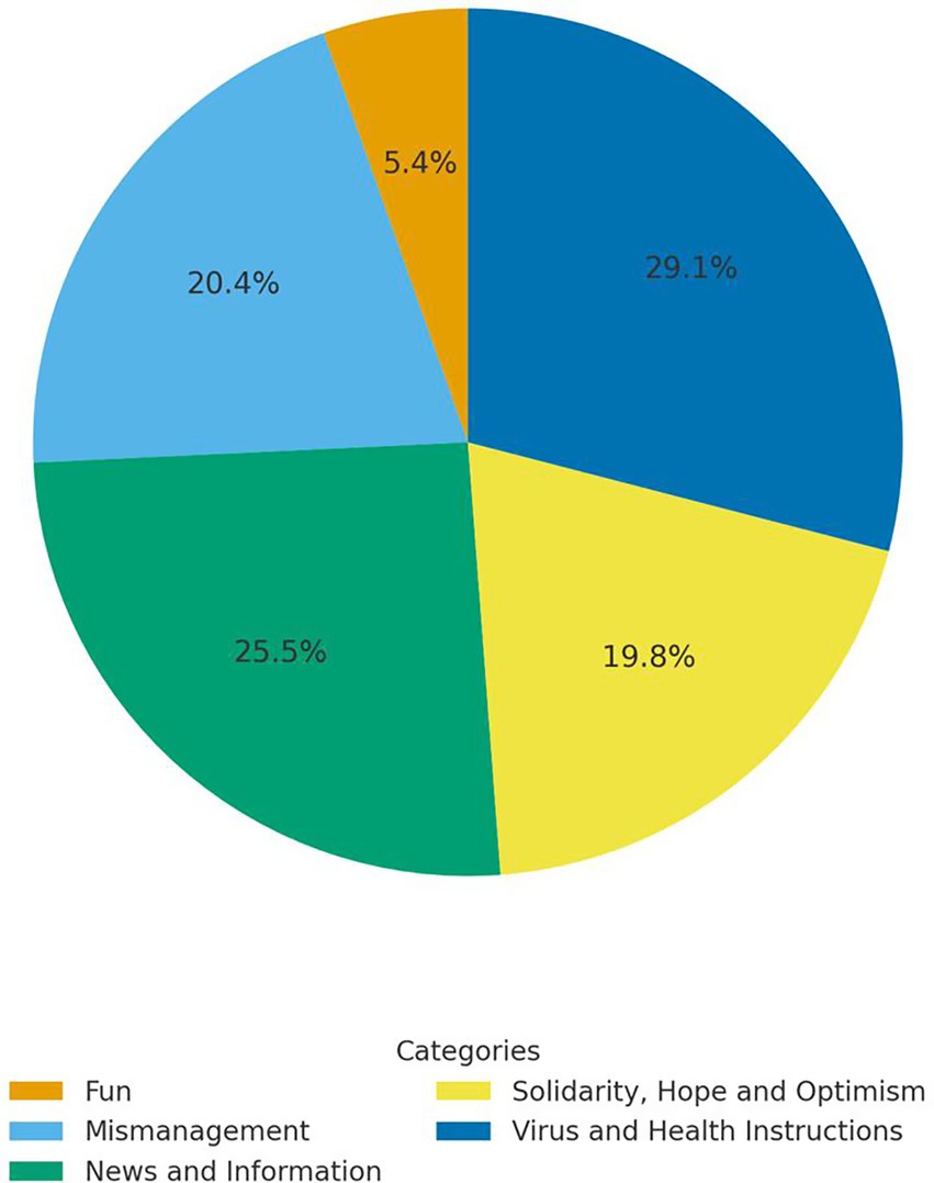 The final theme was fun. People made jokes about the virus as well as other topics during the pandemic. All such messages were flagged as fun. Finally, we added a category of others. This category included many relevant and irrelevant messages. There were messages about the pandemic, but they could not be classified within the main themes. Also, the majority of them were not as much to form a new major theme. Furthermore, there were irrelevant messages. For instance, in some Instagram posts, users mentioned coronavirus as a hashtag just to promote the posts. These messages were identified as others. Nonetheless, the others category was not involved in our analysis.