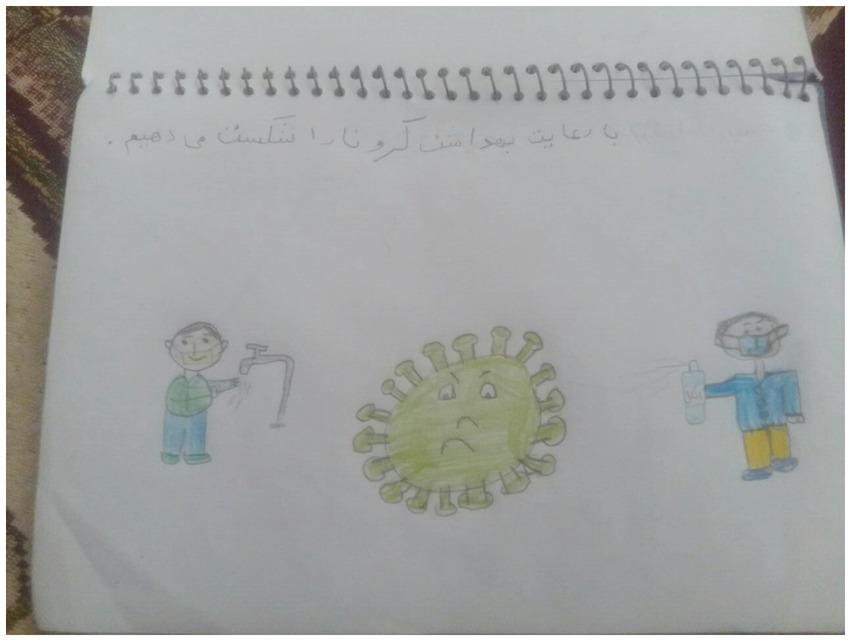 On Telegram, SHO was frequently articulated in a regime-aligned register: posts highlighted state capacity and resilience in managing the crisis and foregrounded the contributions of the Basij and the Islamic Revolutionary Guard Corps (IRGC/Sepah) to pandemic control. Given that these organizations are routinely criticized by opposition groups and human-rights advocates for their role in suppressing dissent, portraying them as protective and community-oriented actors aligns closely with the government’s preferred narrative. This framing often co-occurred with prominent gratitude themes; thanking physicians and medical staff as life-savers during the pandemic, which provided a civic, non-contentious wrapper for otherwise state-affirming messages. In pursuit of broad reach and emotional resonance, many channels also adopted a sentimental tone, further softening the political edge while amplifying compliance and unity cues. The Figure 3 (a drawing by an elementary student urging adherence to health guidance shared on Telegram) provides an example.