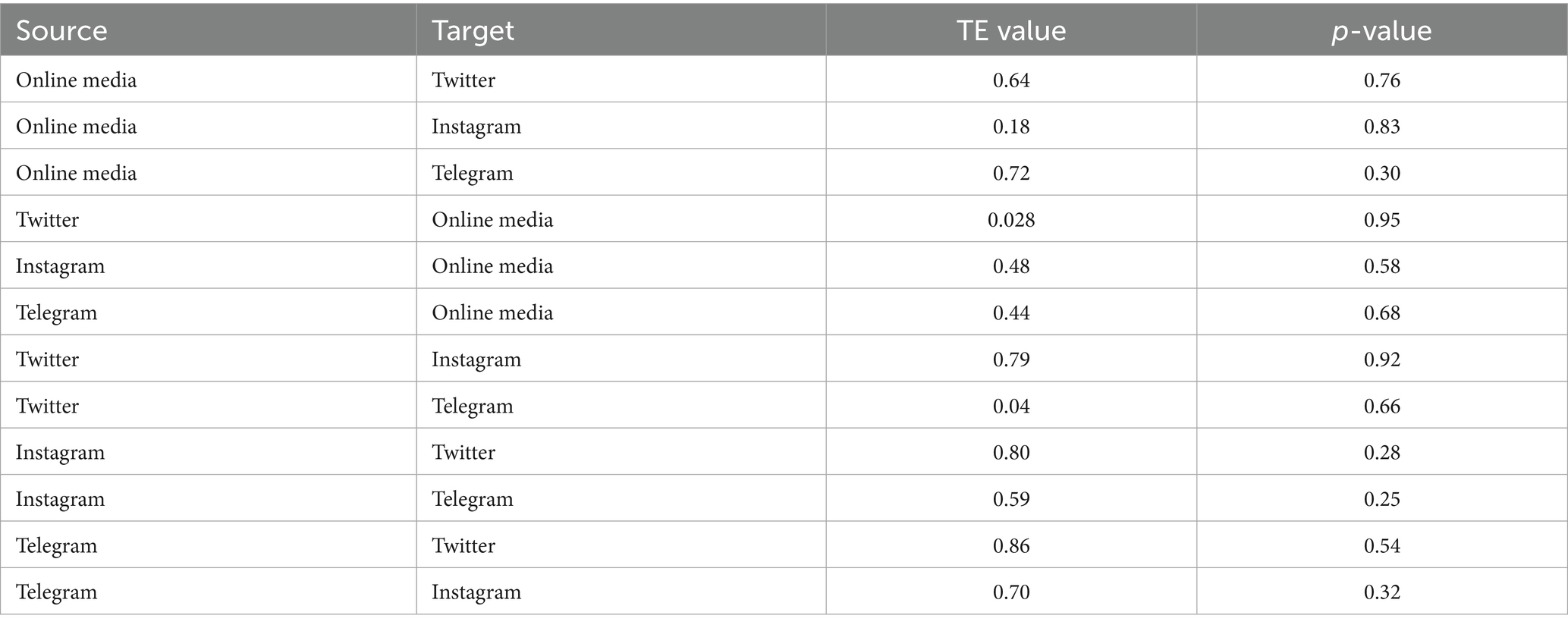 Table 1 shows that across all pairs, no p-value is below 0.05, so we do not reject the null of no directed predictive influence for any source to target pair in this aggregate analysis. This is unsurprising for cross-domain flows between online news and social platforms, but it is noteworthy for social-to-social links where some coupling was expected. Statistically, these are null results, not proofs of absence. We should notice that TE estimates can be attenuated by several factors, such as short or noisy series, common shocks (e.g., nation-wide announcements) that affect platforms simultaneously, and platform access throttling that distorts timing. We will discuss these null findings in the final section.
