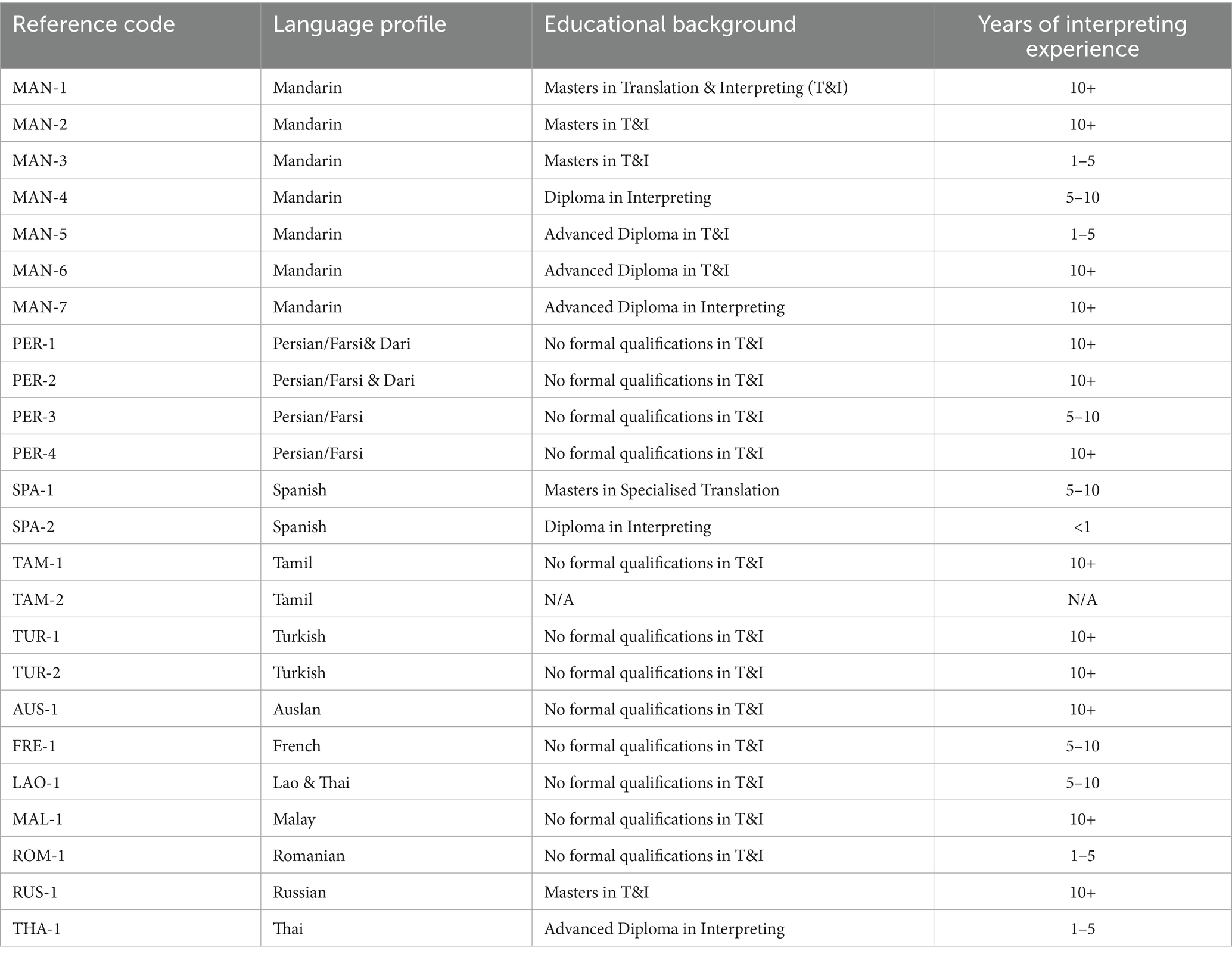 Submitted EOIs were then screened by a research assistant to confirm self-reported eligibility, and those who were deemed qualified were contacted to schedule individual online interviews. A total of 24 interpreters took part in this study, representing 12 different languages: Mandarin (n = 7), Persian/Farsi (n = 4), Spanish (n = 2), Tamil (n = 2), Turkish (n = 2), Australian Sign Language (or Auslan in short) (n = 1), French (n = 1), Lao (n = 12), Malay (n = 1), Romanian (n = 1), Russian (n = 1), and Thai (n = 1). This sample size was deemed sufficient to capture a broad range of linguistic and cultural contexts in Australia, while allowing for thematic saturation. Table 1 presents the assigned reference codes for each participant alongside their corresponding language profiles. All participants provided informed consent and received information on confidentiality measures prior to the interviews.