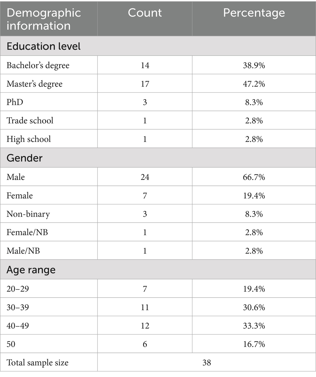While majority male and white, the interview cohort reflected industry demographics (Legault and Weststar, 2021)—See Table 1 for demographic details. Ultimately, in terms of occupational variety, our interviewees represented a variety of game workers commensurate with the industry’s porous boundaries (e.g., Keogh, 2023), including chief officers, presidents, or founders of companies, others ranged from area heads to designers and graphic artists. All participants worked remotely a majority of the time, and all were a part of remote teams – some of which sporadically worked in-office.