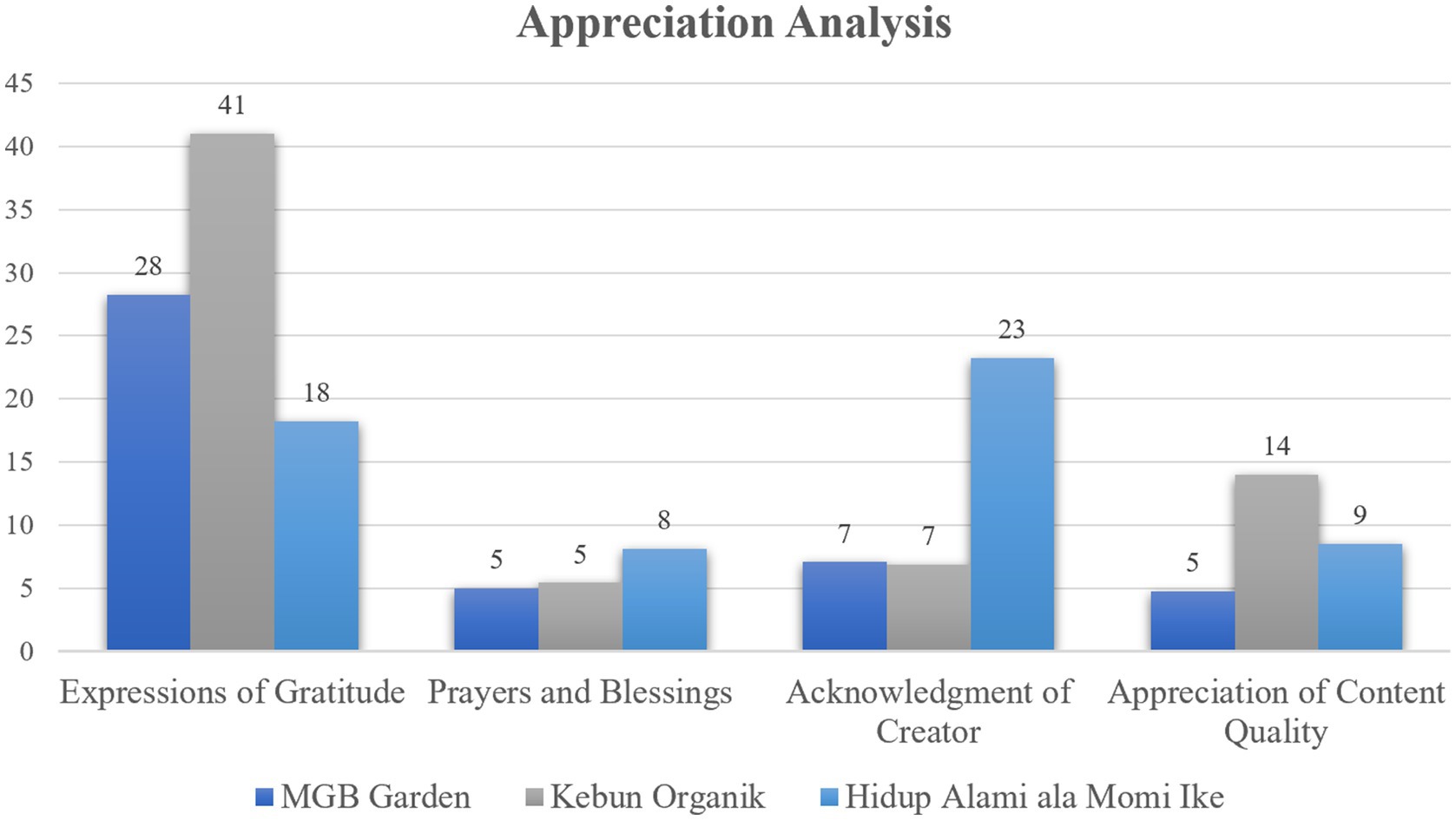 This differential pattern reflects the Indonesian concept of balas budi, a moral obligation of reciprocal exchange that mediates digital engagement in culturally specific ways. While creators who assert technical precision or spiritual authority elicit reciprocal appreciation from viewers (Sudibyo, 2018), communal approaches transform these obligations into recognition and solidarity (Novianti et al., 2025), fostering peer-to-peer support (Soriano and Cabalquinto, 2024) through YouTube’s interactive features and reflecting evolving cultural norms (Khasanah et al., 2023) and participatory practices in Indonesia (Winarnita et al., 2022).