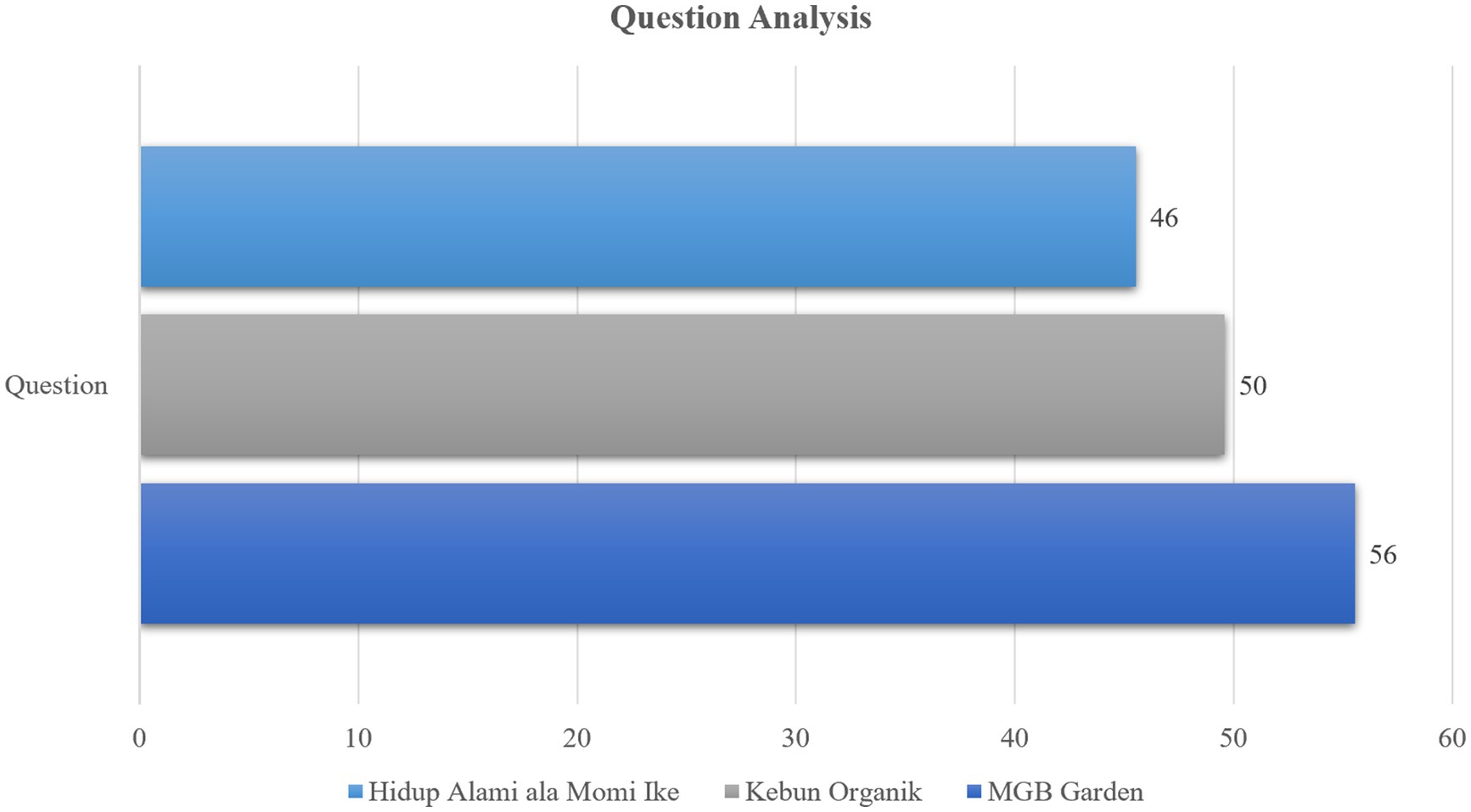 Figure 2 presents the distribution of task-oriented comments, specifically questions raised by viewers. MGB Garden recorded the highest number of questions (n = 56), followed by Kebun Organik (n = 50) and Hidup Alami ala Mommy Ike (n = 46).