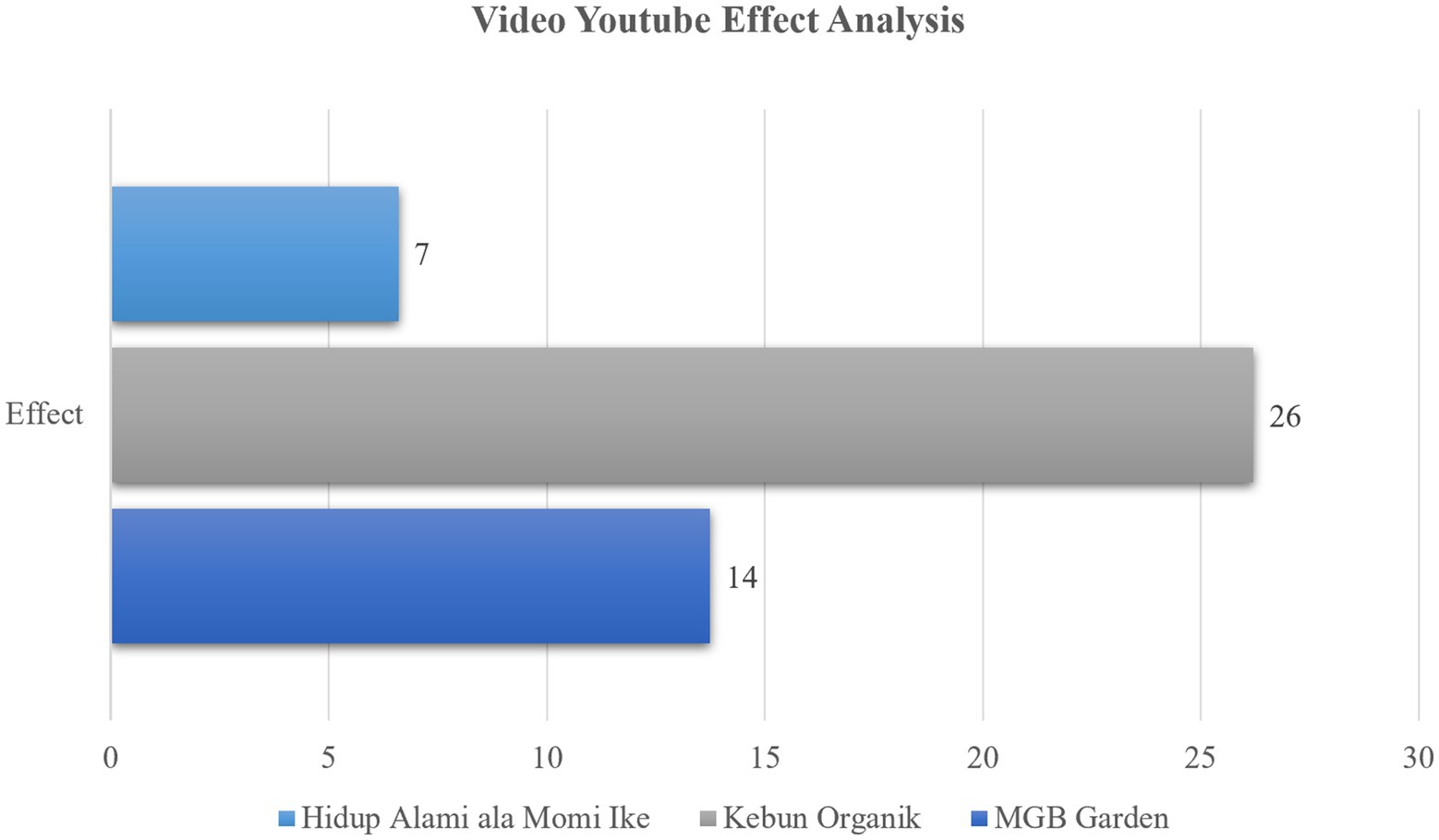 Figure 3 shows the distribution of effect-oriented comments, which reflected viewers’ perceived outcomes after engaging with tutorials. Kebun Organik generated the highest proportion of effect-oriented comments (26%), followed by MGB Garden (14%) and Hidup Alami ala Mommy Ike (7%).