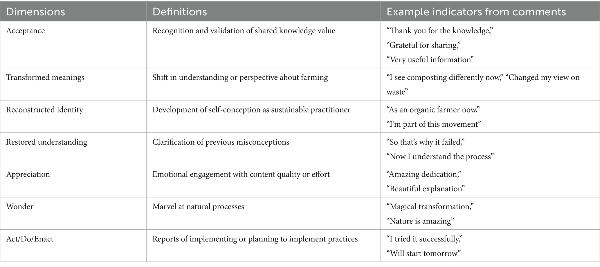 This study presents three novel contributions to the agricultural education literature. First, it provides the first systematic analysis of YouTube-based agricultural learning communities in Indonesia, thus addressing a critical gap in digital agriculture research in Southeast Asia. Second, it introduces a four-stage meaning-making framework that extends beyond traditional learning models to include identity transformations among organic farmers. Third, it integrates cultural dimensions, particularly the Indonesian concept of “balas budi” (reciprocal exchange), into understanding digital learning effectiveness in agricultural contexts. These contributions advance the understanding of how digital platforms foster collaborative learning ecosystems for sustainable agriculture (Esteve-del-Valle and Sarchosakis, 2025).