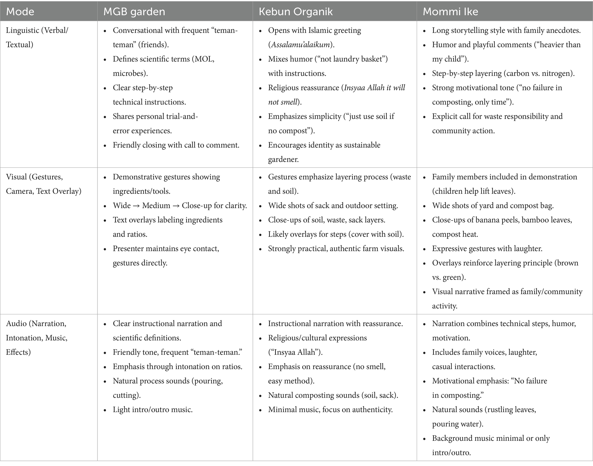 The analysis of three Indonesian YouTube channels, MGB Garden, Kebun Organik, and Hidup Alami ala Momi Ike, shows that although all focus on composting education, each employs distinctive multimodal strategies that shape pedagogical identity and audience engagement (Table 2). Differences emerged across the linguistic, visual, and audio dimensions.
