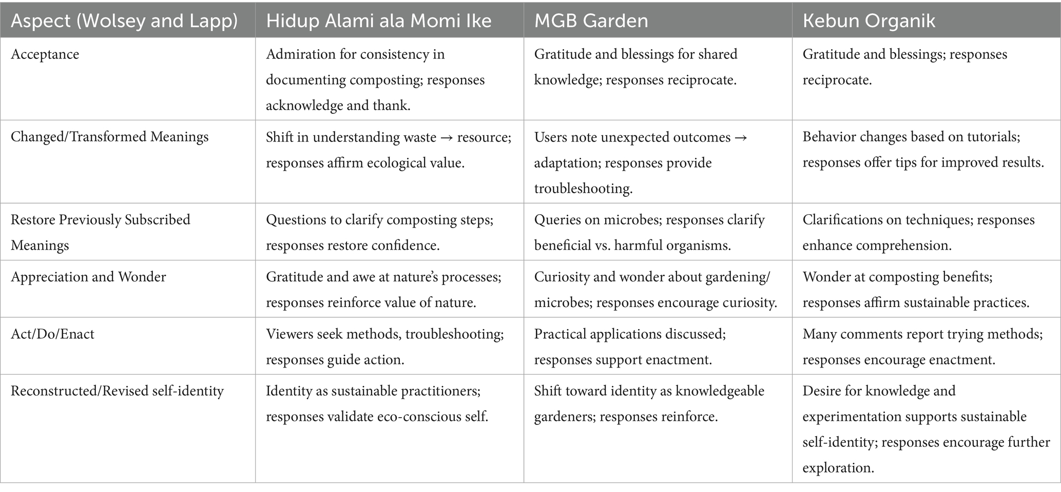 Other aspects included the restoration of previously subscribed meanings, where viewers sought clarification on composting techniques or microbial agents, and responses supplied corrective explanations. Expressions of appreciation and wonder were common across all three channels, highlighting gratitude and curiosity toward natural processes, while responses reinforced these attitudes. Finally, enactment was evident as viewers actively sought guidance for practice, discussed applications, or reported trying methods themselves, and responses supported these actions. In several cases, commenters articulated a reconstructed self-identity, positioning themselves as sustainable practitioners or knowledgeable gardeners, with responses validating and encouraging this emerging identity.