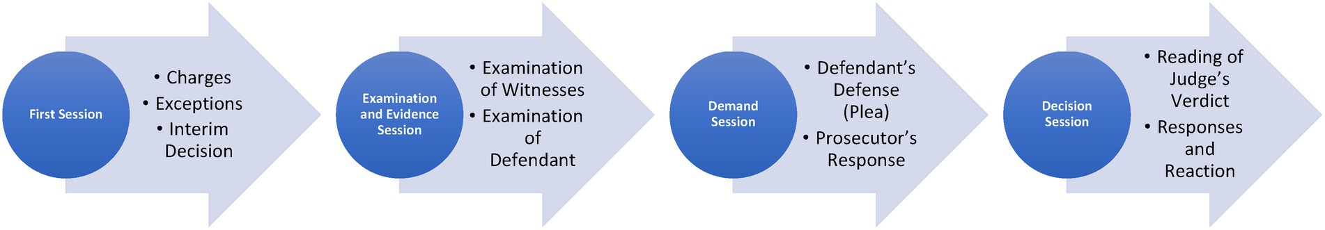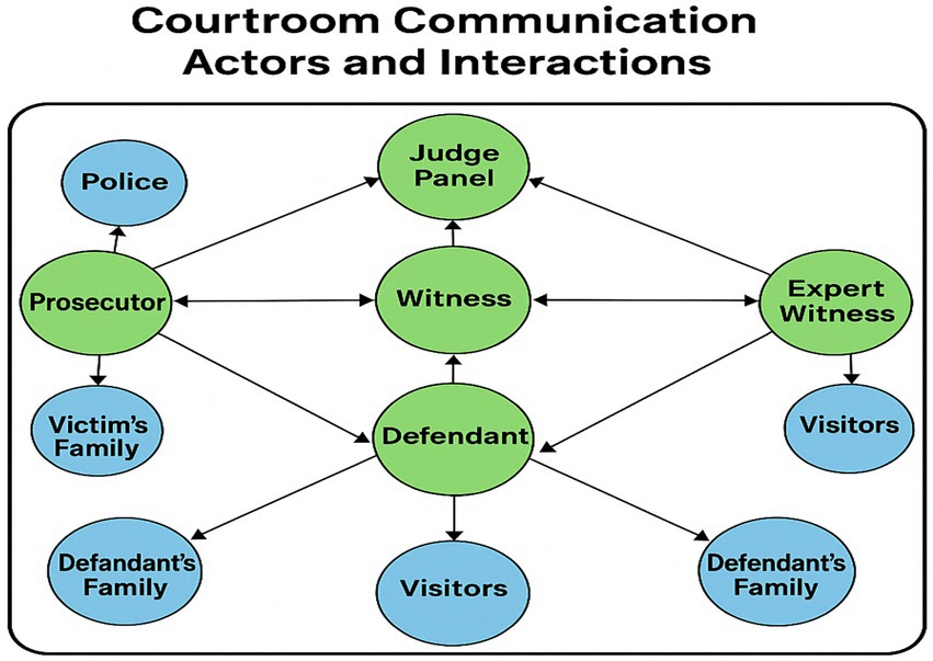 Courtrooms comprise interrelated elements of physical layout, institutional norms, and communicative practices (Bandes and Feigenson, 2020; LeVan, 1984; Rossner et al., 2021). The physical layout refers to the trial facilities, among others, the judge’s bench, prosecutor’s desk, lawyer’s desk, witness bench, and seating for the defendant as well as the audience or visitors to the trial (Hawilo et al., 2022). Meanwhile, norms and values are elements that support the principle of conducting open, transparent and fair trials, including the provisions and communication processes carried out in achieving the objectives of the trial. Every element in the courtroom, from the physical layout to the various rules including the rules of communication, aims to support a fair and impartial judicial process (Gordon and Druckman, 2018). In this environment, communication plays an important role, in determining the outcome of the judicial process (Otu, 2015; Turner and Hughes, 2022). Through communication, trial actors share information, in order to achieve the intended goals (Widodo, 2022; Widodo et al., 2018).