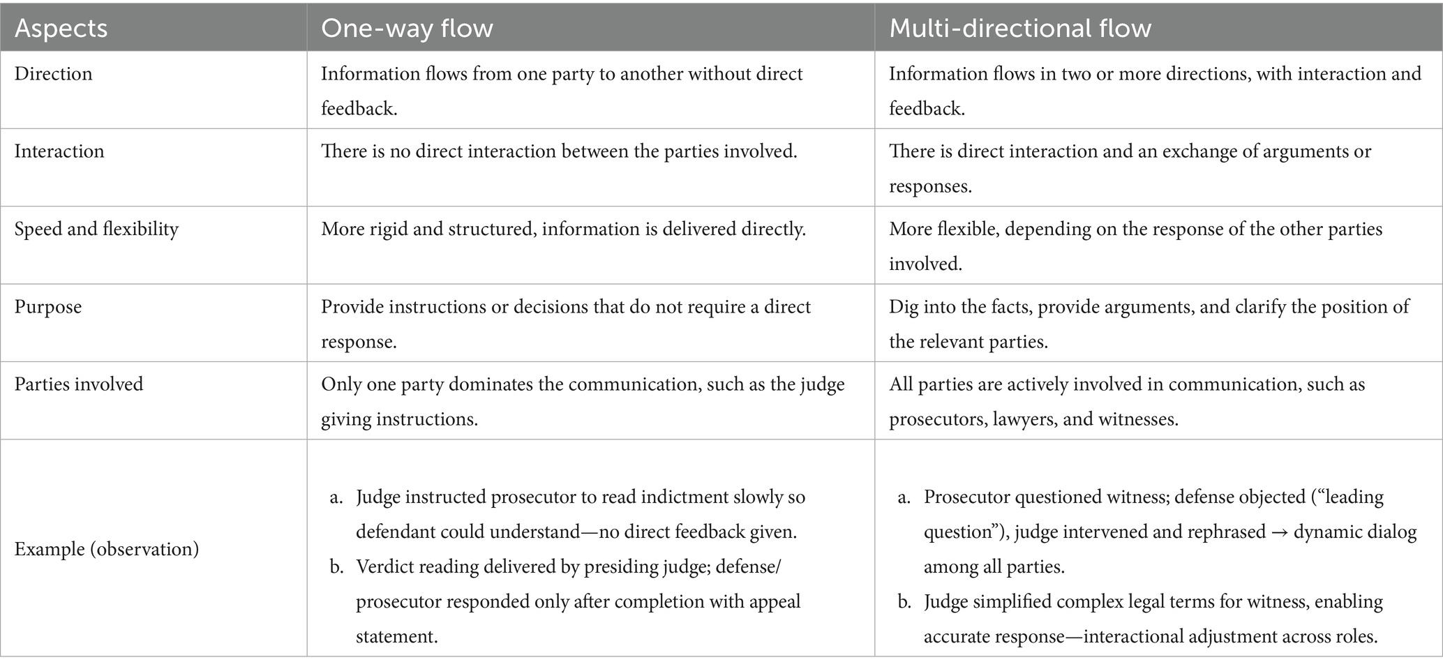 In the courtroom, there are two forms of communication flows that dominate the judicial process, namely the one-way flow and the multi-directional flow, each of which has an important role in the course of the trial. One-way flow occurs when information flows from one party to another without any immediate feedback at the time. An example is when the judge gives instructions or decisions, such as reading the verdict or directing the course of the trial. In this stream, other parties, such as prosecutors or lawyers, simply receive information without being able to provide an immediate response at that time. In contrast, a multi-directional flow occurs when several parties engage in interactive communication, such as in the question and answer process between prosecutors, lawyers, witnesses, and defendants. In interrogation, each party gives a response that affects the course of the conversation, creating a dynamic dialog and interacting with each other. Although these two streams differ in terms of interaction and communication structure, they have the same goal, which is to ensure that the trial process runs fairly and transparently. The one-way flow serves to provide clear and firm instructions, while the multi-way flow deepens the understanding of the facts revealed during the trial. Both are important in supporting the achievement of legitimate and fair legal decisions. The following Table 1 is meant.