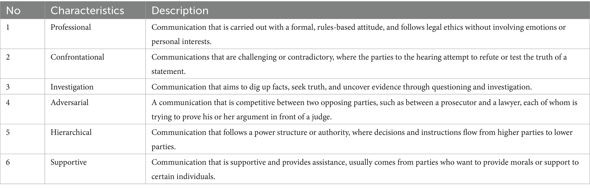Another characteristic found is investigative communication, judges, prosecutors, and lawyers to dig up facts and test the validity of information from witnesses or defendants. The judge often asks clarifying questions to ensure consistency in the testimony given, as in the case where the judge asks, “Brother witness, in the BAP you mentioned that the incident occurred at 9:00 p.m., but the police report said it was 10:00 p.m. Can you explain the difference?.” The interviewed judge explained, “Our job is not only to hear, but also to clarify and ensure that there is no contradictory information. We have to find the truth based on the evidence.” Based on this information, investigative is evidenced by the process of digging or searching for more detailed and in-depth information.