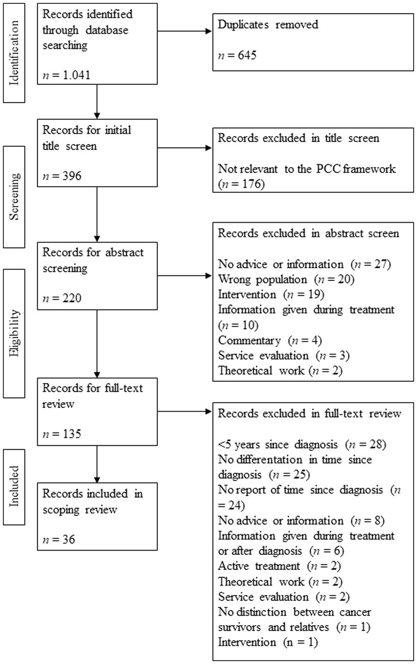The population of LTCS was defined as people living with a cancer diagnosis for more than 5 years. The key concepts of ‘Advice’ and ‘Information’ in this study were defined as any written or spoken interpersonal or media-mediated information, data, knowledge, or recommendation that was not part of medical or psychological therapy, i.e., no psychological, genetic, diet or activity counseling or programming from a healthcare provider or professional, survivorship care planning or medical services. Information and advice about these services and topics are included, such as details on where to find them and the types of services available.