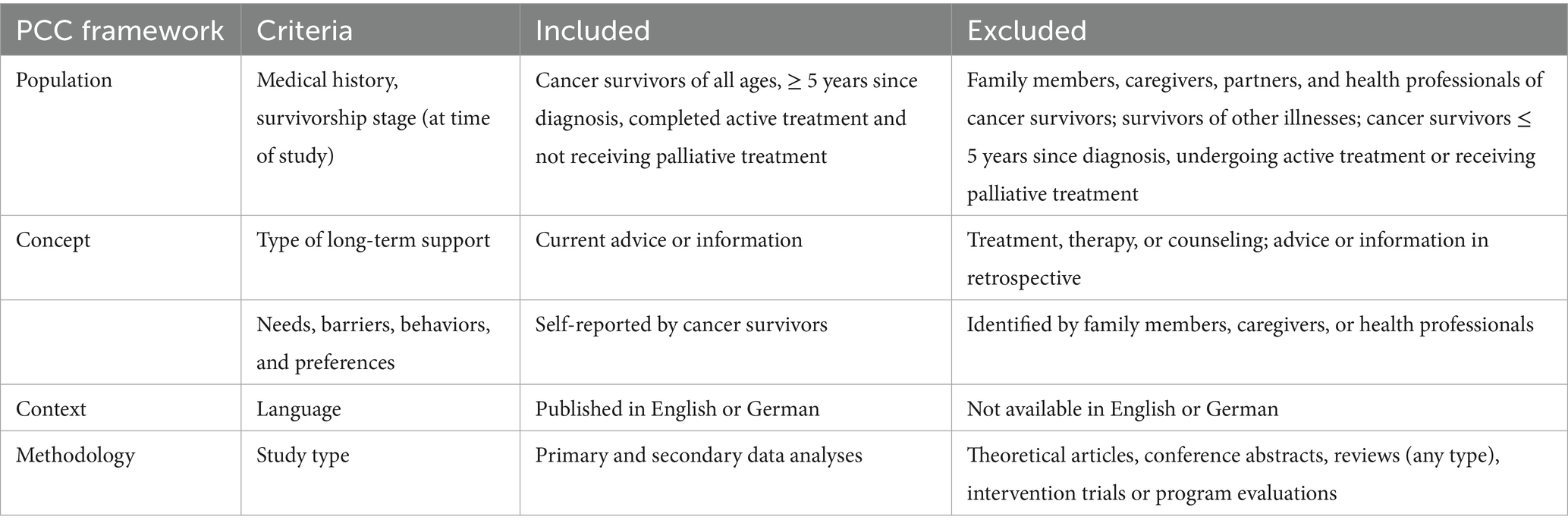 ‘Information needs’ were defined as the motivational dispositions, information requests, or expressions of information wanted to have, while ‘preferences’ referred to the formal aspects of information needed, i.e., the type, delivery mode, the portrayal, the way of access, or the time survivors wanted to receive the information. ‘Behavior’ was defined as any action to seek, scan, non-seek, or avoid information or advice self-reported by cancer survivors, and ‘Barriers’ as conditions or characteristics, e.g., sociodemographic ones, to finding and understanding information or advice self-reported by cancer survivors. Inclusion and exclusion criteria for study selection using the Population-Concept-Context (PCC) framework (Peters et al., 2020) are presented in Table 1.