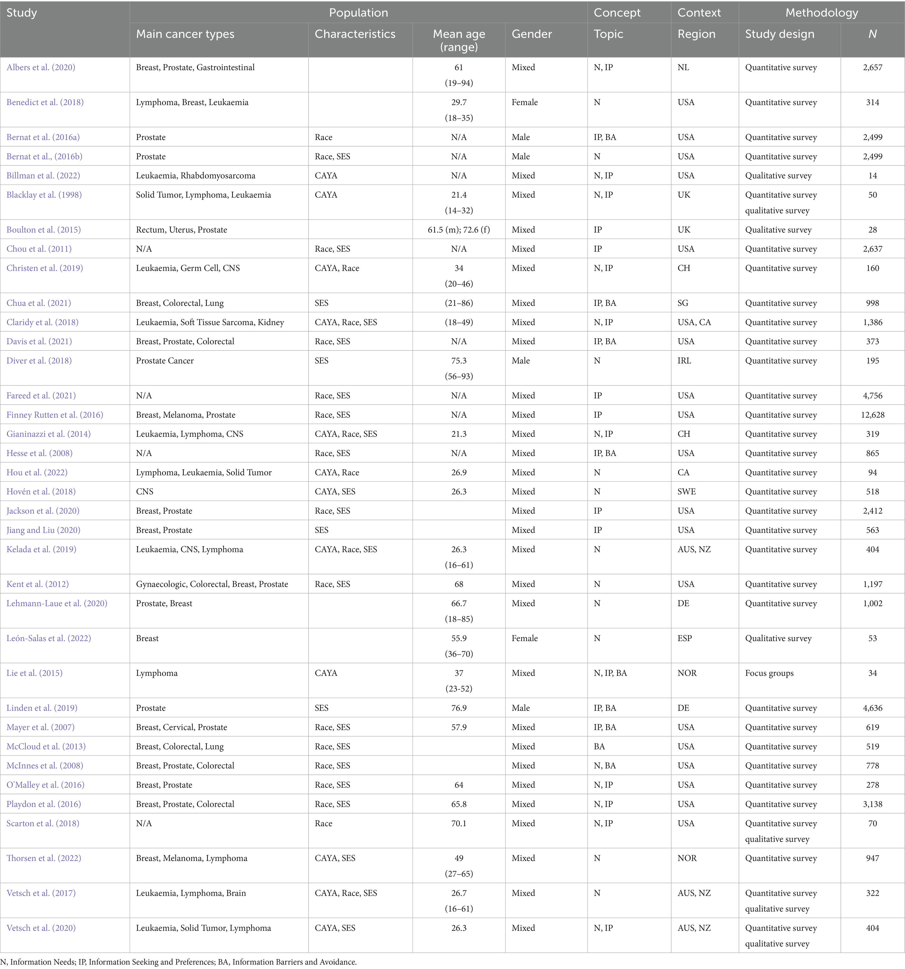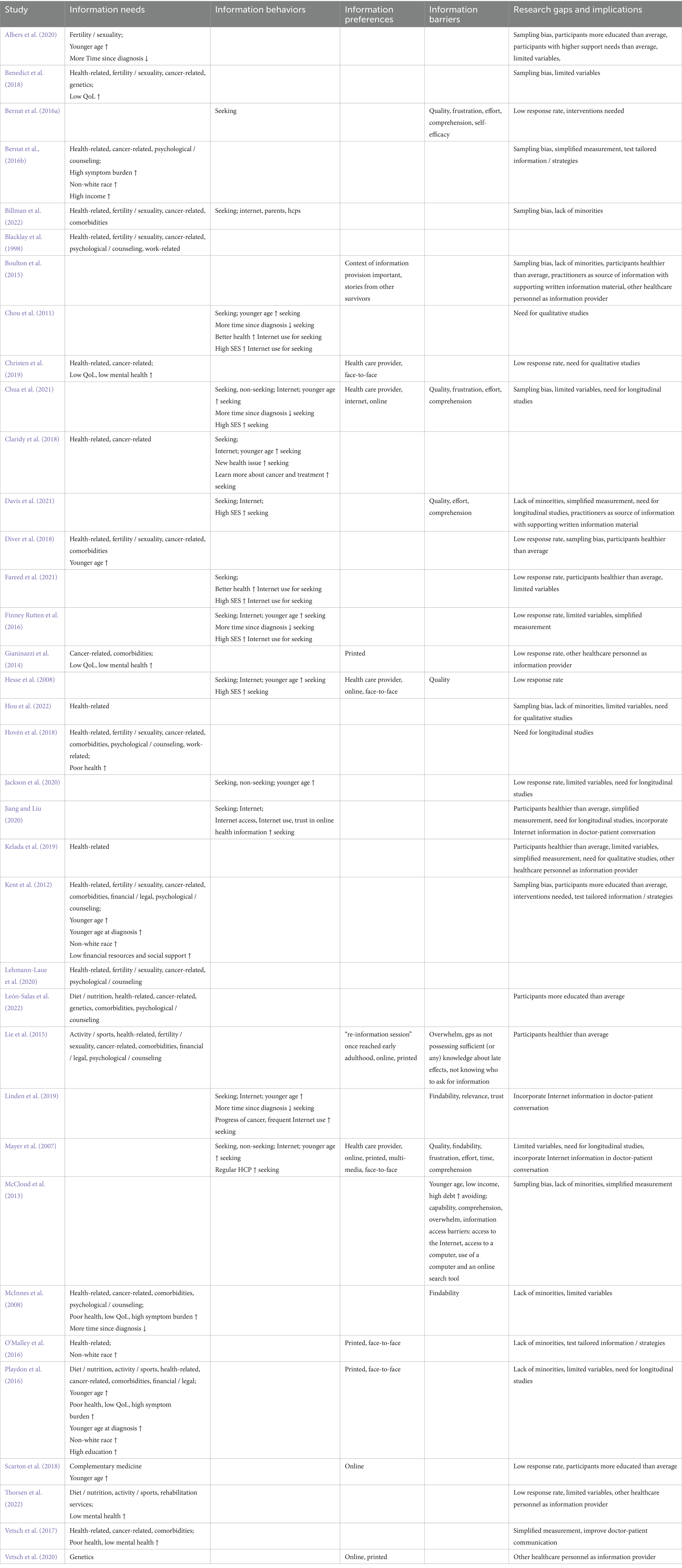 Several studies gave recommendations, addressing the need for qualitative studies to gain in-depth insights into information needs and behaviors, and longitudinal studies to analyze the changes over time and in relation to different cancer survivorship states (Mayer et al., 2007; Chou et al., 2011; Playdon et al., 2016; Christen et al., 2019; Kelada et al., 2019; Jackson et al., 2020; Jiang and Liu, 2020; Chua et al., 2021; Davis et al., 2021; Hou et al., 2022; see Table 3). Interventions to assess the effectiveness of tailored information and individual care plans were also recommended (Kent et al., 2012; Bernat et al., 2016a; Bernat et al., 2016b; O’Malley et al., 2016; see Table 3).
