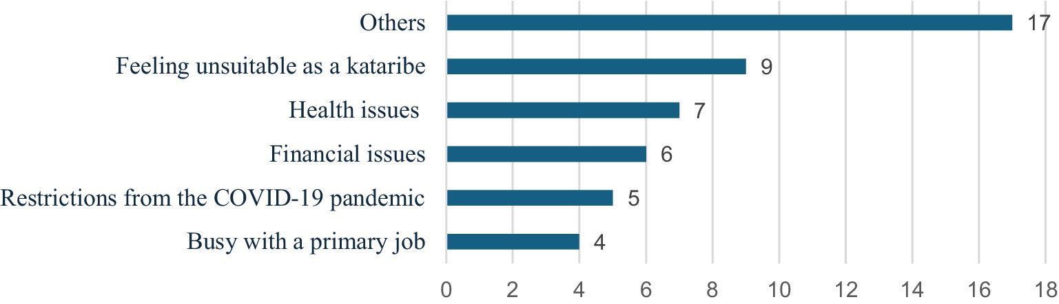 Among the 72 participants, about half (n = 32; 44.4%) reported experiencing difficulties continuing as a kataribe. The most common reason given was feeling unsuitable as a kataribe (n = 9; 29.0%), followed by health issues (n = 7; 22.6%), financial problems (n = 6; 19.4%), restrictions from the COVID-19 pandemic (n = 5; 16.1%), and busy with a primary job (n = 4; 12.9%) (Figure 1).