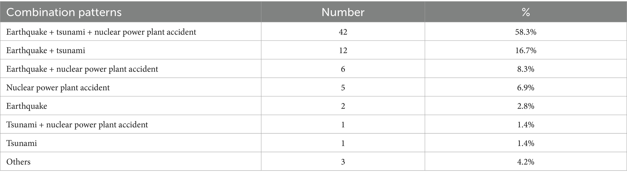 In total, 35 (48.6%) participants had joined the kataribe via self-initiation. Regarding position, 39 (54.2%) belonged to a group, 12 (16.7%) were privately active, and 21 (29.1%) were active both in a group and privately. The duration of kataribe activity was as follows: 38 (53.5%) had been active for 1–4 years, 15 (21.1%) for 5–9 years, and 18 (25.4%) for ≥ 10 years. Regarding the frequency of storytelling, 36 (52.2%) responded once per month, 19 (27.5%) once every 2 weeks, and 14 (20.3%) more than once per week. Moreover, 60 (83.3%) had a place where they regularly told a story (Table 1). Regarding topics, 62 (86.1%) participants talked about the GEJE, 56 (77.8%) about the tsunami, and 54 (75.0%) about the FDNPP accident. Table 2 shows the details regarding the combinations of stories about disasters. The most common patterns included three disasters, such as the GEJE, tsunami, and FDNPP disaster in one story (58.3%, n = 42), followed by the tsunami and GEJE (16.7%, n = 12), the GEJE and FDNPP disaster (8.3%, n = 6), only the FDNPP disaster (6.9%, n = 5), and various disaster patterns.