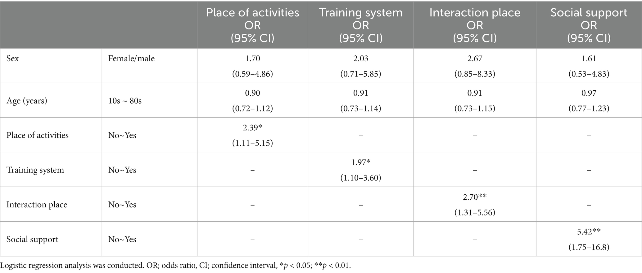 The chi-square test was used to assess differences between the difficulty of continuing kataribe activities and each question item. Logistic analysis was used to evaluate each kataribe system’s independent association with the difficulty of continuing the storytelling activity. Age and sex were included as adjustment factors in each model. All data were statistically analyzed using SPSS Statistics 29.0 (IBM Armonk, New York, NY, United States), with the level of statistical significance set at p < 0.05.