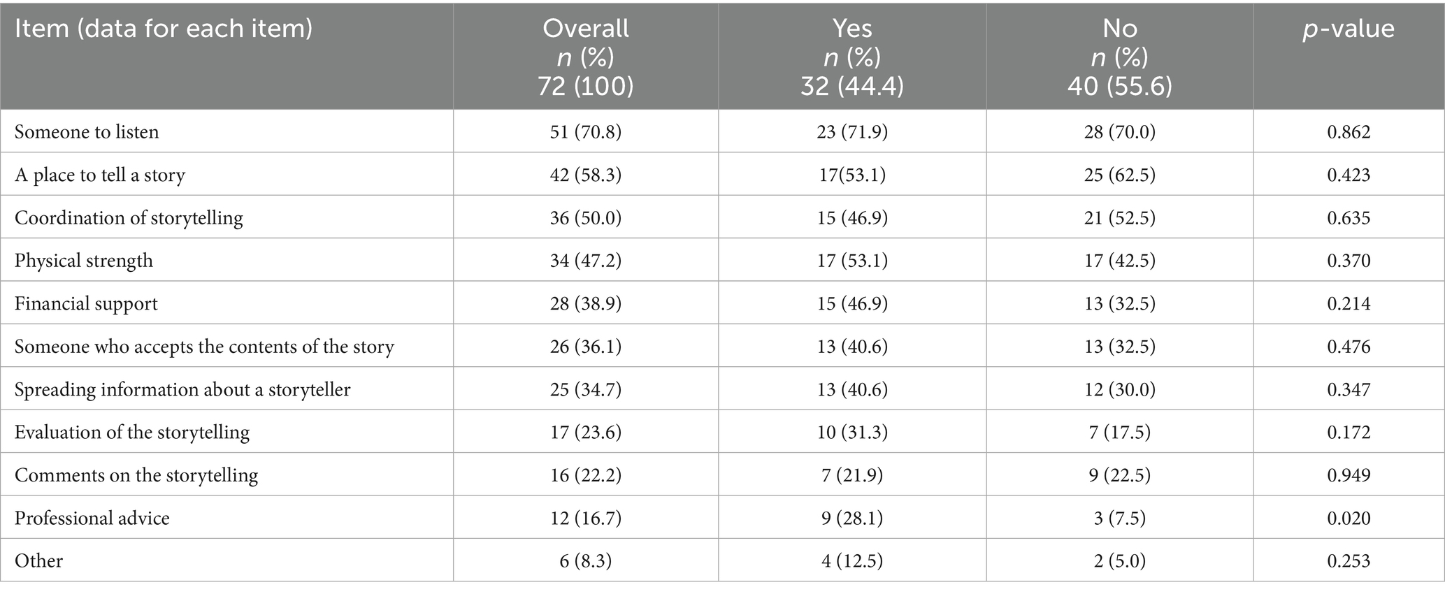 Table 7 shows the reasons considered necessary to continue storytelling activities. The most highly necessary thing was someone to listen to their story [n = 51 (70.8%)], followed by a place where they could tell their story [n = 42 (58.3%)], people or organizations for coordinating their storytelling [n = 36 (50.0%)], physical strength [n = 34 (47.2%)], financial support [n = 28 (38.9%)], someone to accept the contents of the story [n = 26 (36.1%)], and spreading information about the kataribe [n = 25 (34.7%)]. By contrast, evaluations [n = 17 (23.6%)], comments [n = 16 (22.2%)], and professional advice [n = 12 (16.7%)] were needed less than the other things related to storytelling.
