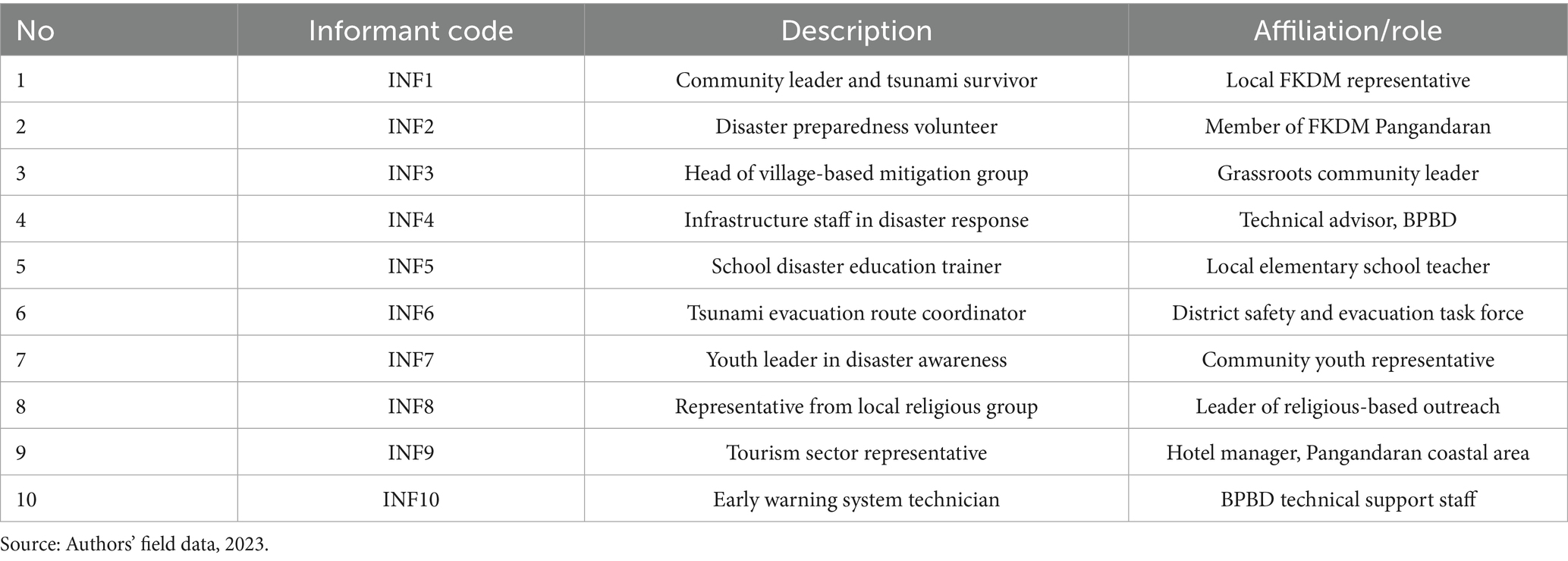 The interviews were conducted using an open-ended guide, allowing participants to freely express their experiences, perspectives, and knowledge (Agwenda and Yesicha, 2024). Thematic saturation was achieved after conducting 10 in-depth interviews. All sessions were audio recorded (with consent), transcribed verbatim, and analyzed thematically to identify recurring patterns, insights, and divergences. Key participants include 10 individuals selected through purposive sampling, each holding strategic roles in disaster preparedness efforts. As described in Table 1, research participants are FKDM representatives with firsthand experience in tsunami evacuation simulations (INF1, INF2), a village head who oversees community mitigation protocols (INF3), and BPBD infrastructure technicians responsible for early warning systems (INF4, INF10). Also included are a school-based disaster educator (INF5), youth leaders and religious figures supporting public awareness (INF7, INF8), and a coastal tourism operator who balances safety messaging with economic concerns (INF9).