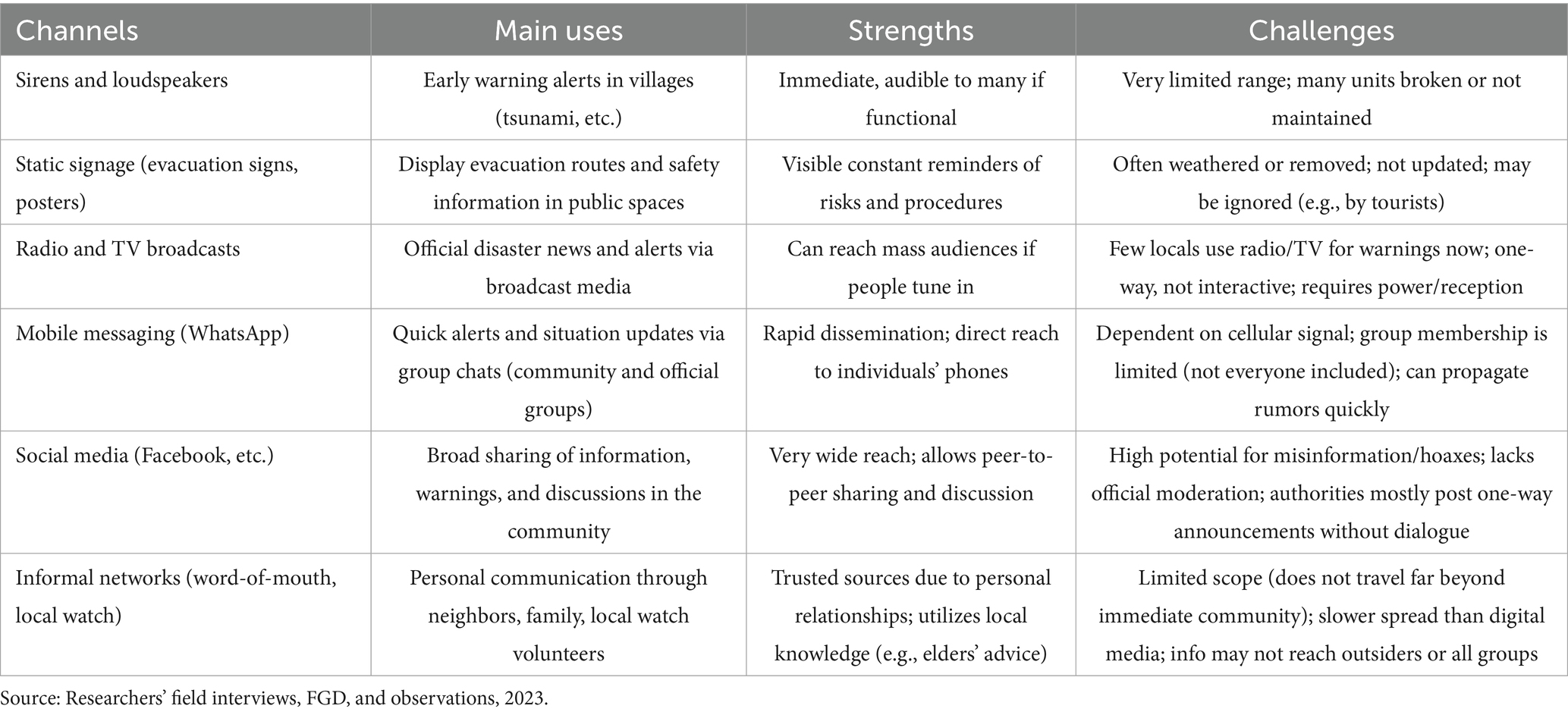 The communication landscape in Pangandaran combines modern and traditional channels, but none is fully reliable as described in Table 2. Sirens and signs are conceptually good tools but suffer from disrepair. Radios and posters are nearly obsolete. Social media and phones dominate, yet misinformation and coverage gaps undermine their benefit. These findings suggest the need for a multi-pronged strategy: reinforcing low-tech alerts (e.g., sirens, public address systems) while improving digital messaging and community networks. The literature on disaster risk communication underscores similar lessons: redundancy is key, and trusting relationships between authorities and communities are essential for information to be heeded.