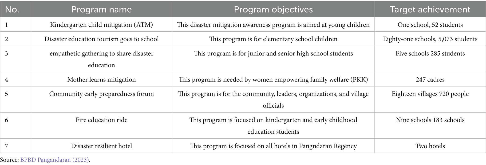 Then, based on the facts and data of disasters that occurred, the Pangandaran Regency government, through the Regional Disaster Management Agency (BPBD), implemented various programs to assist the community in disaster management, both in the form of direct assistance during disasters and community awareness programs in disaster management/disaster mitigation. Seven programs have been implemented to educate the community since 2017. Several education and training programs related to disaster mitigation are conducted in the Pangandaran Regency area.