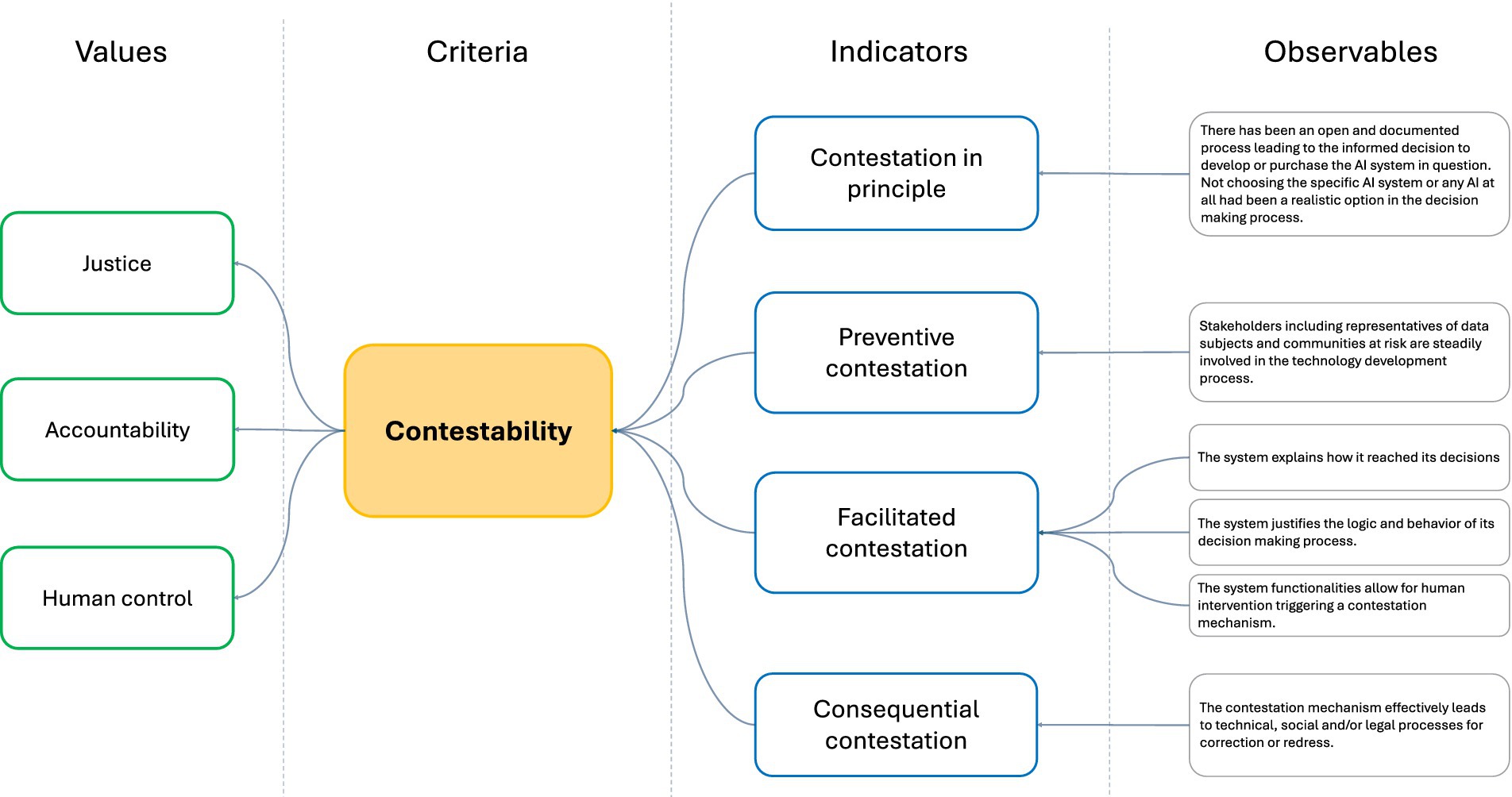 Against this background, it particularly matters whether and how contestability is addressed in these normative instruments. The VDE Spec 90012 includes, for example, various provisions that support contestability, addressing issues such as transparency (e.g., documentation of datasets and model training, intelligibility of results, mechanisms enabling human oversight and human-in-the-loop), privacy (e.g., cybersecurity measures, review and rectification mechanisms) and fairness (stakeholder involvement, impact analysis, procedures evaluating and mitigating algorithmic discrimination, justifications, working and supply chain assessments, evaluations of ecological sustainability). Currently, such general tools for AI alignment are further tailored to particular AI application fields. An example in this direction is the DIN Spec 91517 on requirements for trustworthy AI methods in police applications, which has been co-developed by the authors (DIN, 2025). Moreover, the EU has recently published a first version a code of practice for general-purpose AI models, which will support the implementation of the AI Act’s rules for providers of general-purpose AI models and general-purpose AI models with systemic risks, together with the Guidelines on the scope of the obligations for general-purpose models (European Commission, 2025). For instance, these guidelines provide a procedure for an AI provider to contest the European Commission’s ex officio classification or designation of a general-purpose AI model, as being as a general-purpose with systemic risk. Another example are the standards and rules contained both in the code of practice and the guidelines for general-purpose AI models to comply with the obligation imposed by the AI Act of having a copyright right policy as well as compulsory summary about the content used for training that AI model (Art. 53(1)(c)-(d)). These obligations might favor some forms of contestation stemming from rightholders, but within the scope of the AI Act and EU law. Taking the VCIO model as a template, Figure 1 proposes a direction of how contestability in AI systems can be considered and accounted for. In our visual example, contestability would probably best be considered as a criterium that contributes to the accomplishment of multiple values like justice, accountability and human control. Strong contestability would, on the other side, be characterized by several manifestations (indicators) like categorical contestation of use, preventive contestation, contestation in interaction and contestation with impact. These indicators could then be further concretized by specific measures (observables) that include technical and governance-related aspects. In the description of indicators and observables, we used the term ‘contestation’ instead of ‘contestability’ to make clear that these items are understood as empirical entities (and not as normative ideals as in values and criteria).1