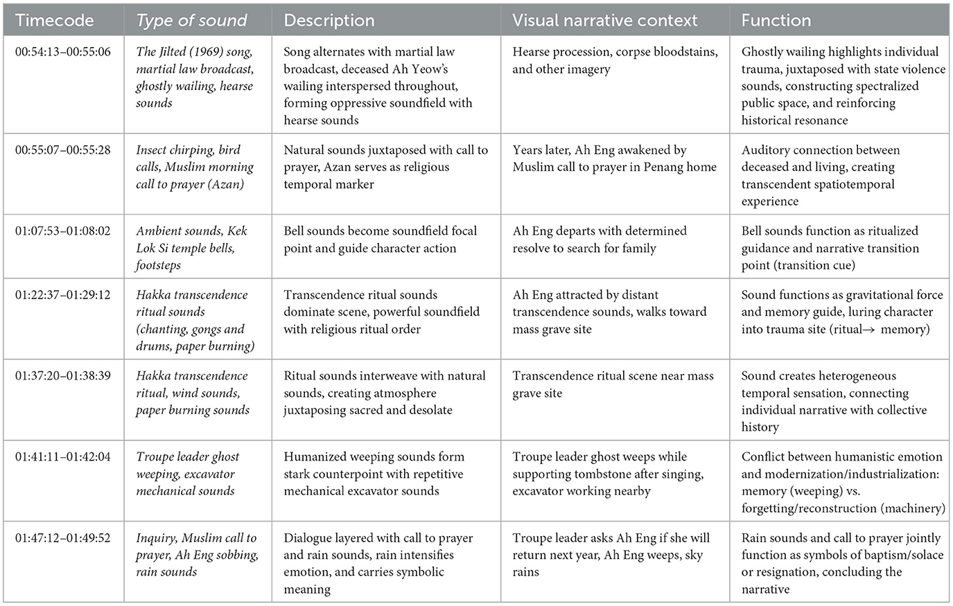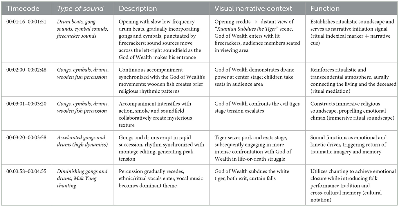 Through multiple viewings of the film, auditory events are meticulously categorized and recorded in timecode format (see Tables 1–3). The sound categories include religious and ritual sounds such as bells, chanting, and Taoist rituals; ghost and hallucinatory sounds such as spirit summons and broadcast noise; and natural and environmental sounds such as rain, night insects, and wind. In each of the three main analytical sections, a representative scene is selected, and in-depth sampling analysis is conducted, using timecodes to avoid arbitrariness and subjectivity, providing verifiable evidence to support the argument.