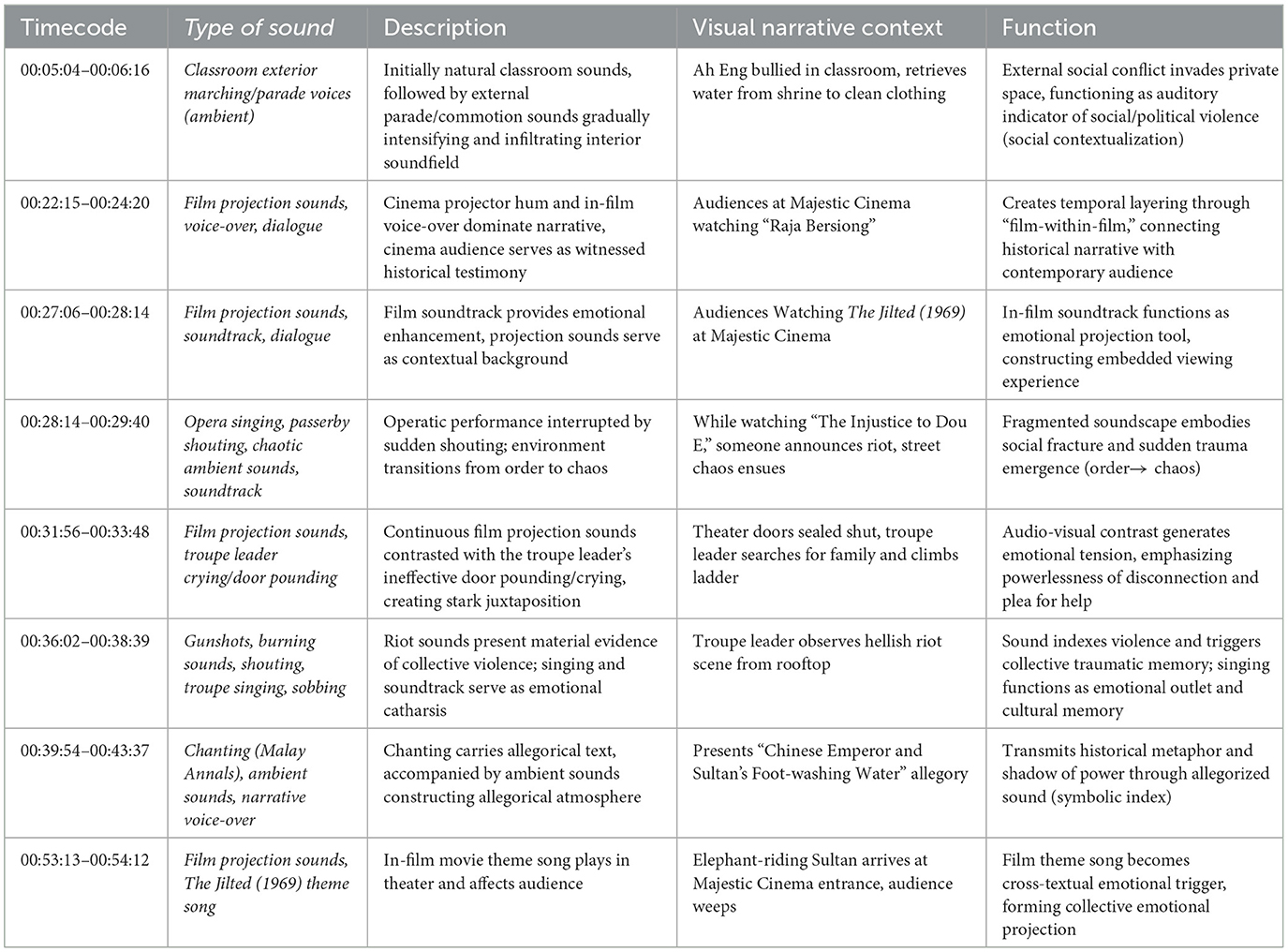 In the Malaysian cultural context, religious sounds exhibit a distinctive syncretic quality. This syncretism is not only evident in musical forms but also in the transmission of religious practices and cultural memory. For instance, the percussive sounds of gongs and drums in Chinese temple festivals, the vocal styles of the Malay traditional theater bangsawan, and the multi-ethnic participation in religious celebrations collectively form a “syncretic soundscape” that transcends singular religious boundaries. Tan's research on bangsawan reveals how this performance form integrates Malay, Chinese, Indian, and Western musical elements, serving as a sonic representation of Malaysia's multicultural identity (Tan, 1993). This context-specific theoretical perspective underscores that Southeast Asian religious sounds cannot be adequately understood through the Western binary framework of sacred vs. secular; rather, they require an appreciation of their “syncretic spirituality.” Furthermore, Malaysian scholarship on the ritual functions of traditional music offers significant theoretical support for this study. The concept of “bunyi alam” (natural sounds) in traditional Malay music theory emphasizes the intrinsic connection between sound, cosmic order, and the spiritual realm. This perspective posits that specific sounds possess the capacity to invoke spirits, heal the soul, and connect with ancestors, engaging in a compelling dialogue with Western soundscape theories that prioritize ecological and social analyses. Cinema, as a highly sensory and synesthetic art form, has redefined the significance of sound within the broader “sonic turn” in cultural theory, becoming a powerful conduit for the articulation of affect, sociopolitical meaning, and identity. In film, sound often exceeds its technical or narrative function, acquiring ritualistic, mediatic, and mnemonic dimensions. In the cultural context of Sinophone communities in Southeast Asia, religious sound is deeply entwined with local knowledge systems and embodied practices shaped by multilingual, multiethnic, and multireligious interactions. The clang of gongs and drums, ritual chanting, funeral laments, operatic performances, and temple soundscapes are not only markers of cultural identity, but also perceptual traces of ethnic trauma and fractured memory. These layered sonic forms, saturated with religious significance, serve as mediums of historical re-enactment across time and space. Within this framework, Hirsch's (2012) theory of “postmemory” offers a crucial lens through which to understand how sound operates as a carrier of trauma and inherited memory. Hirsch contends that those who did not directly experience a traumatic past may nonetheless inherit its affective imprint through images, narratives, and sonic experiences. This becomes particularly salient in Snow in Midsummer, where sound functions not merely as a vehicle for recalling history, but as a means of acoustically binding individual and collective trauma. As Hirsch suggests, sound becomes a medium of postmemory—an auditory path through which audiences “hear trauma.” This view is further reinforced by Laub's (1995) work on “traumatic listening.” According to Laub, trauma often escapes verbal articulation but may be re-evoked through sound and other sensory experiences, forming what he describes as a “heard but unseen voice”—a sonic embodiment of trauma, haunting, and the unspeakable. These disembodied yet emotionally charged sounds become the “echoes of trauma,” giving form to historical suffering in sensory terms and providing a space for both characters and audiences to confront the unresolved past.