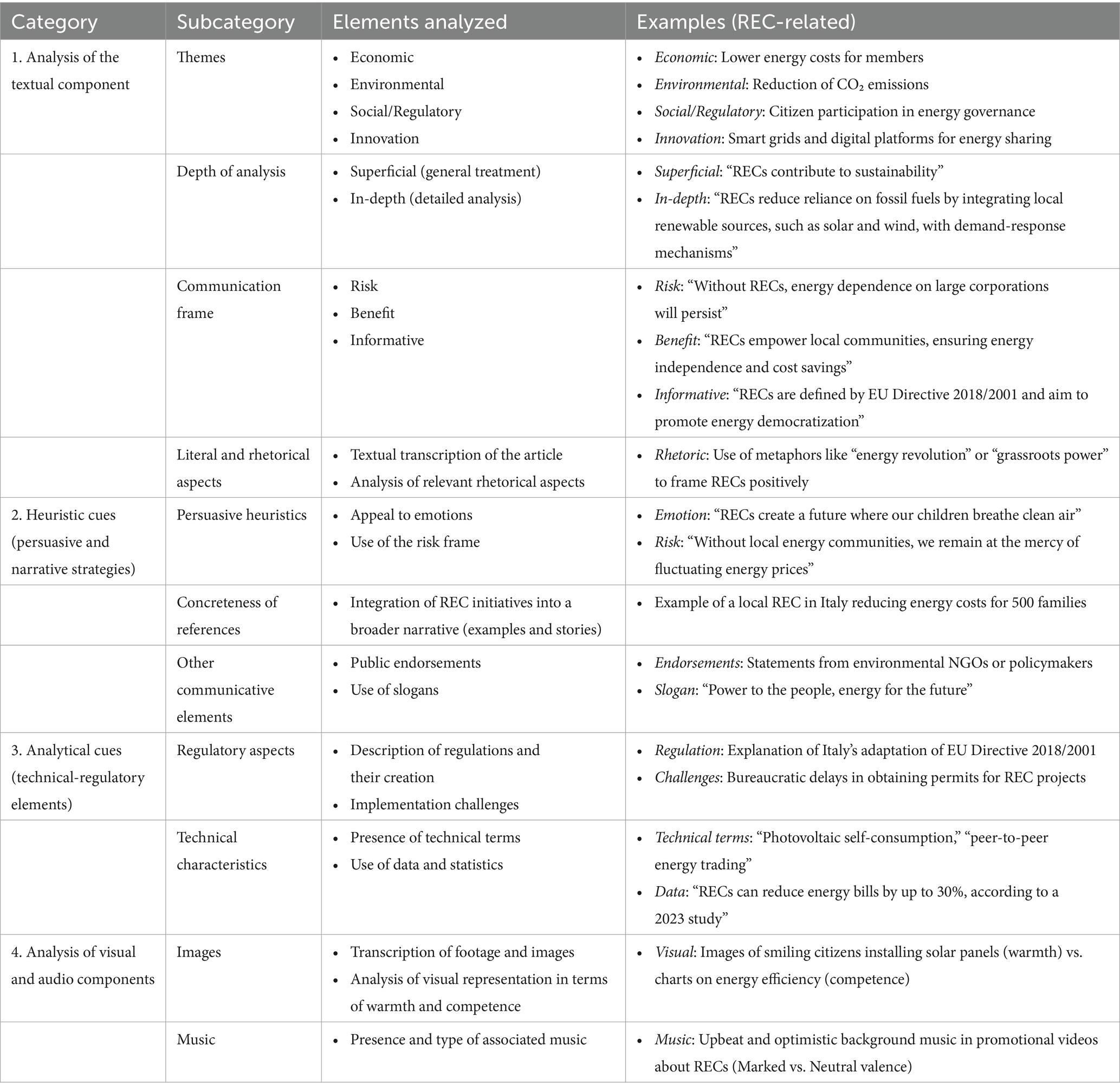 To fill this gap, this work aims to propose an integrated methodological approach, meaning that both textual/verbal and audio-video features are simultaneously considered in a global analytical procedure. In line with the theoretical framework of the Elaboration Likelihood Model (ELM; Petty and Cacioppo, 1986; Briñol and Petty, 2008) as well as with the dual models in persuasive communication (Chaiken, 1989), several communicative elements concerning RECs will be outlined. The investigation of main arguments, discursive strategies, frames, and audio-visual cues will contribute to outlining the main persuasive features of video news focusing on Renewable Energy Communities (RECs) in Southern Italy, considering both their nature (solidarity-based or not) and their project status (under development or already implemented). The aim is to identify communicative strategies that may provide useful insights for fostering citizen engagement and participation by activating either analytic or heuristic processing routes.